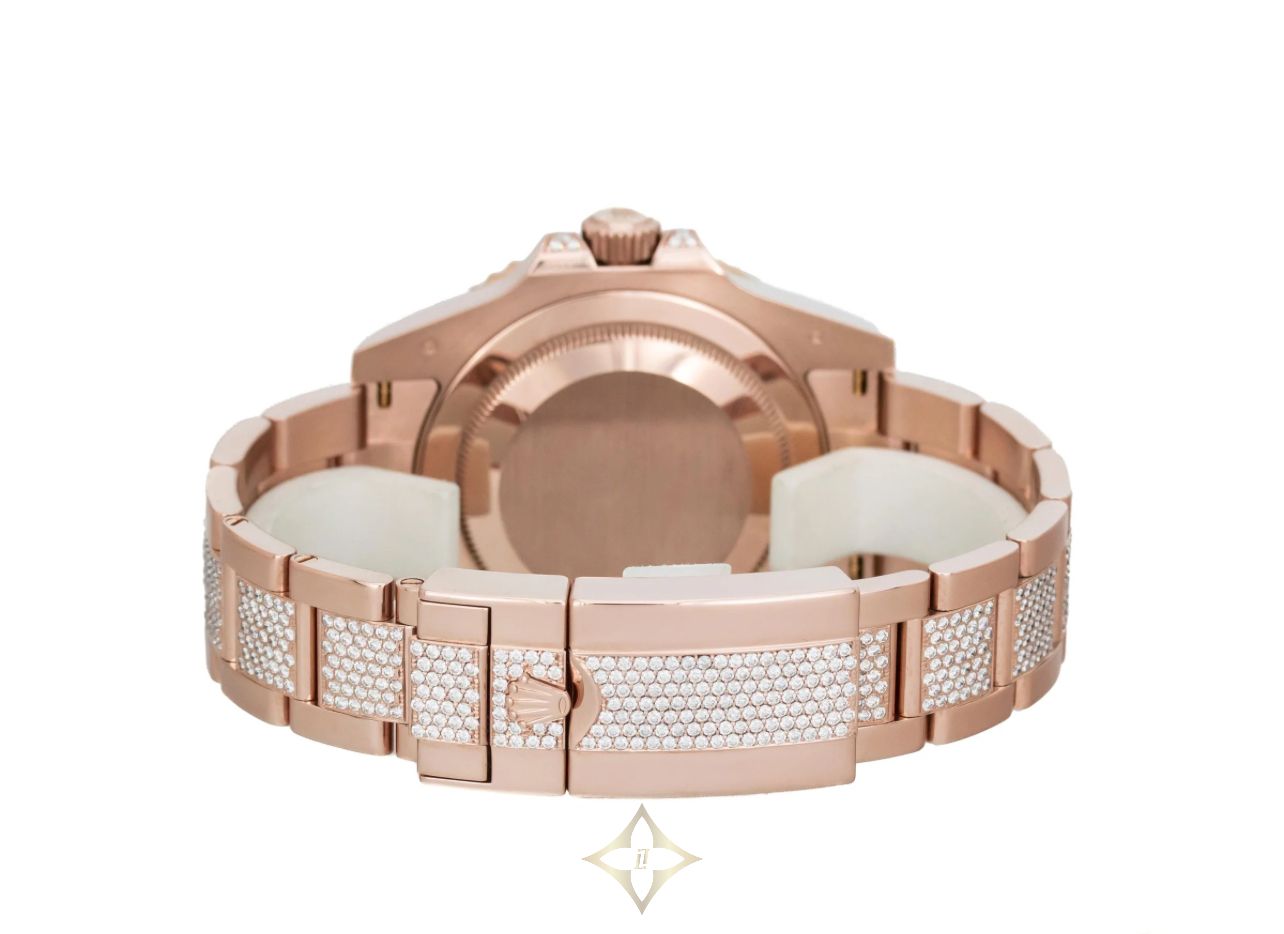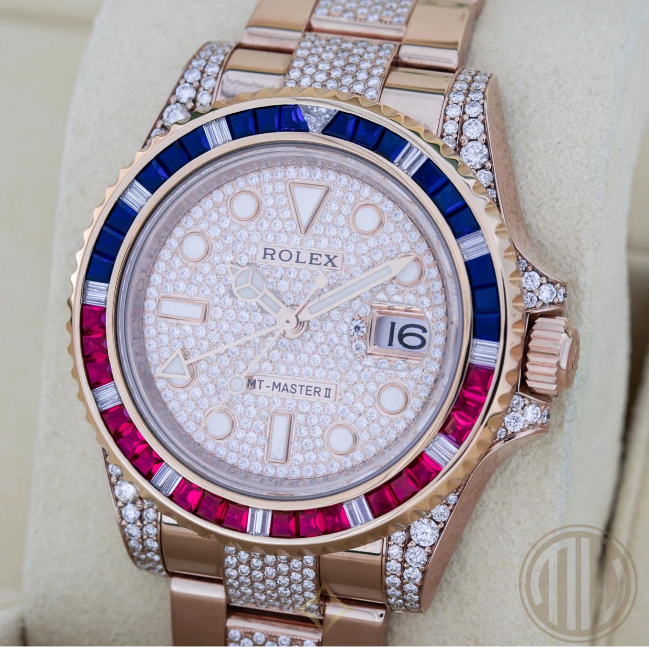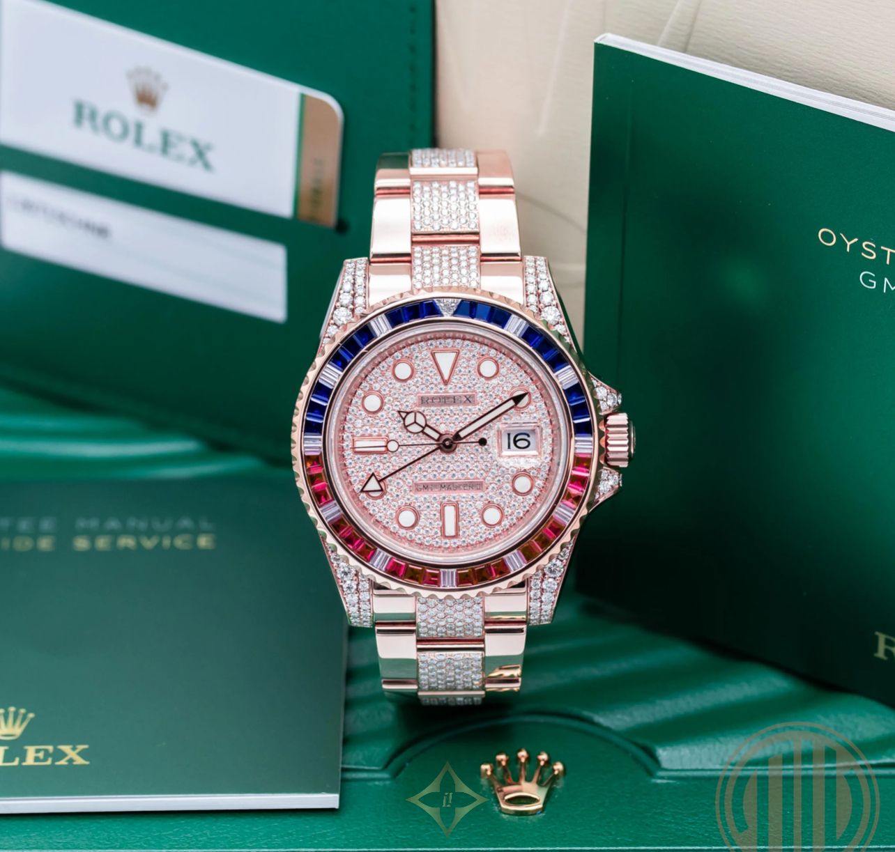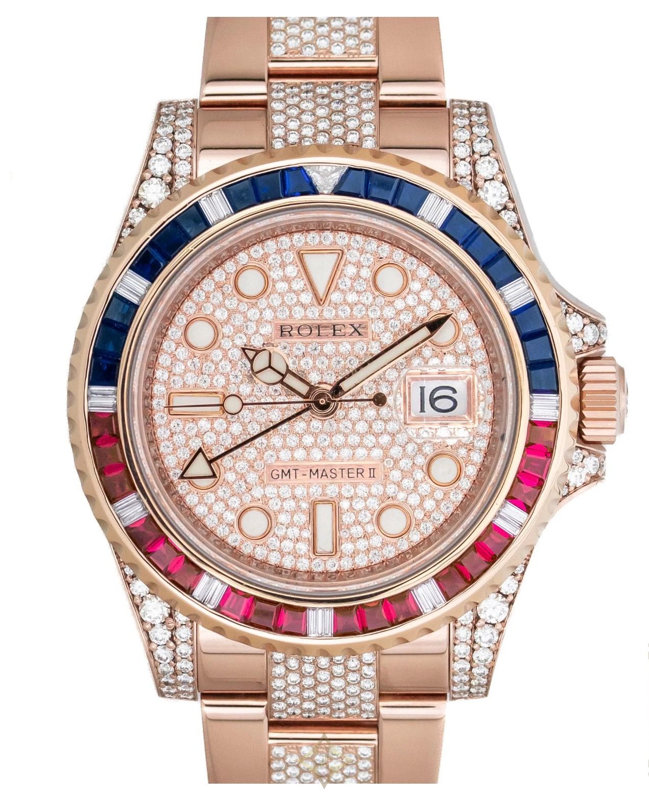 Rolex GMT-Master II / SARU BESATZ RIVER DE VVS | 126715CHNR PRICE; €79.500,00 Tax included Manufacturer: Rolex Model: GMT Master II Reference number: 126710CHNR Year: 2020 Material: 750 rose gold Box: Yes Papers: Yes Elevator: automatic Diameter: 40mm Rolex GMT Master 2 Ref: 126715CHNR 750 rose gold SARU trim Date of first purchase: 2020 Original case and strap and clasp were released in 2022 by a master jewel setter perceived to the highest perfection. Case: horns, crown guard Bezel: SARU OPTIK Band: central strip Closure: median strip Dial: Complete All of the finest brilliant cut diamonds were used processed in River D – E VVSI quality A total of 826 brilliant-cut diamonds totaling approx. 19.8 carats were processed. ——— Móric Watches Damenstiftstrasse 2 D-80331 Munich, Germany Tel: +49 89 260 11 640 Mobile / Whatsapp: +49 176 32 83 66 59 Email: info@mwatches.de