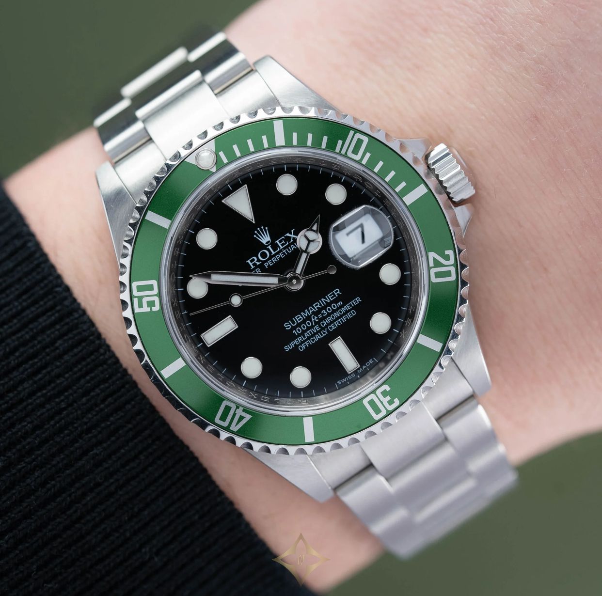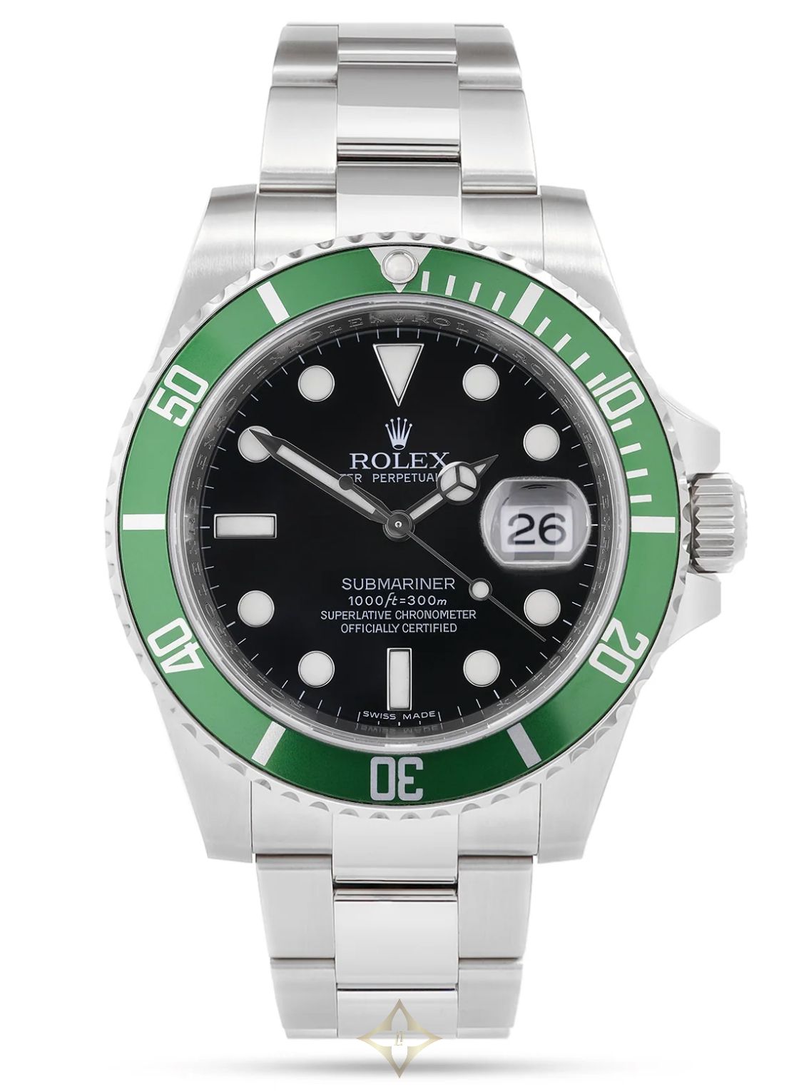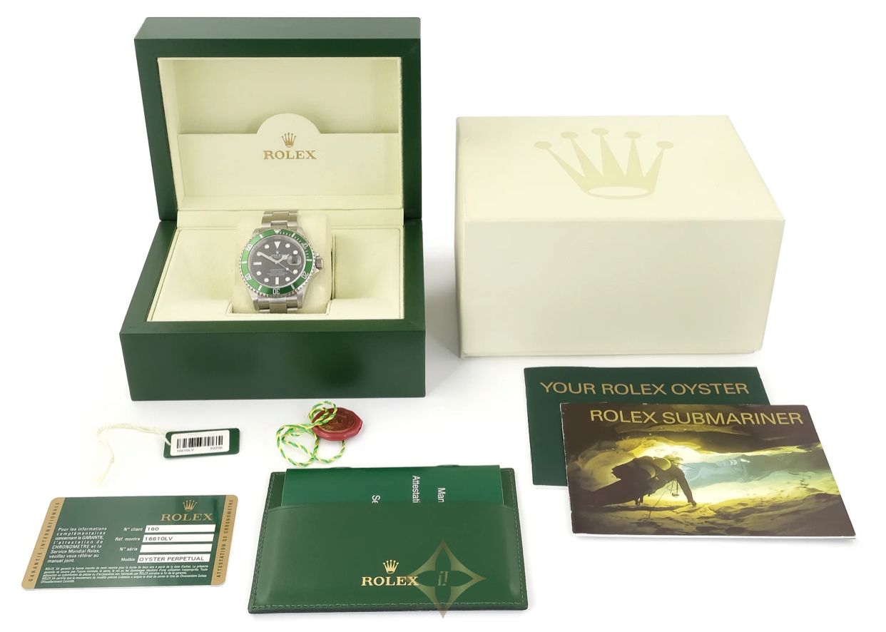 A Rolex Submariner 50th Anniversary 'Kermit' ref. 16610LV. This watch features a 40mm stainless steel case with a green aluminium bezel and black dial. The watch is fitted with a stainless steel Oyster bracelet complete with an Oysterlock clasp.