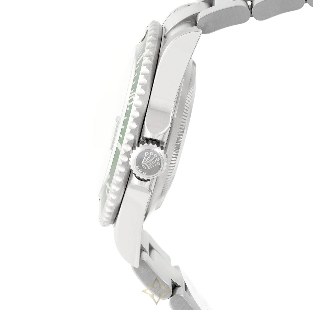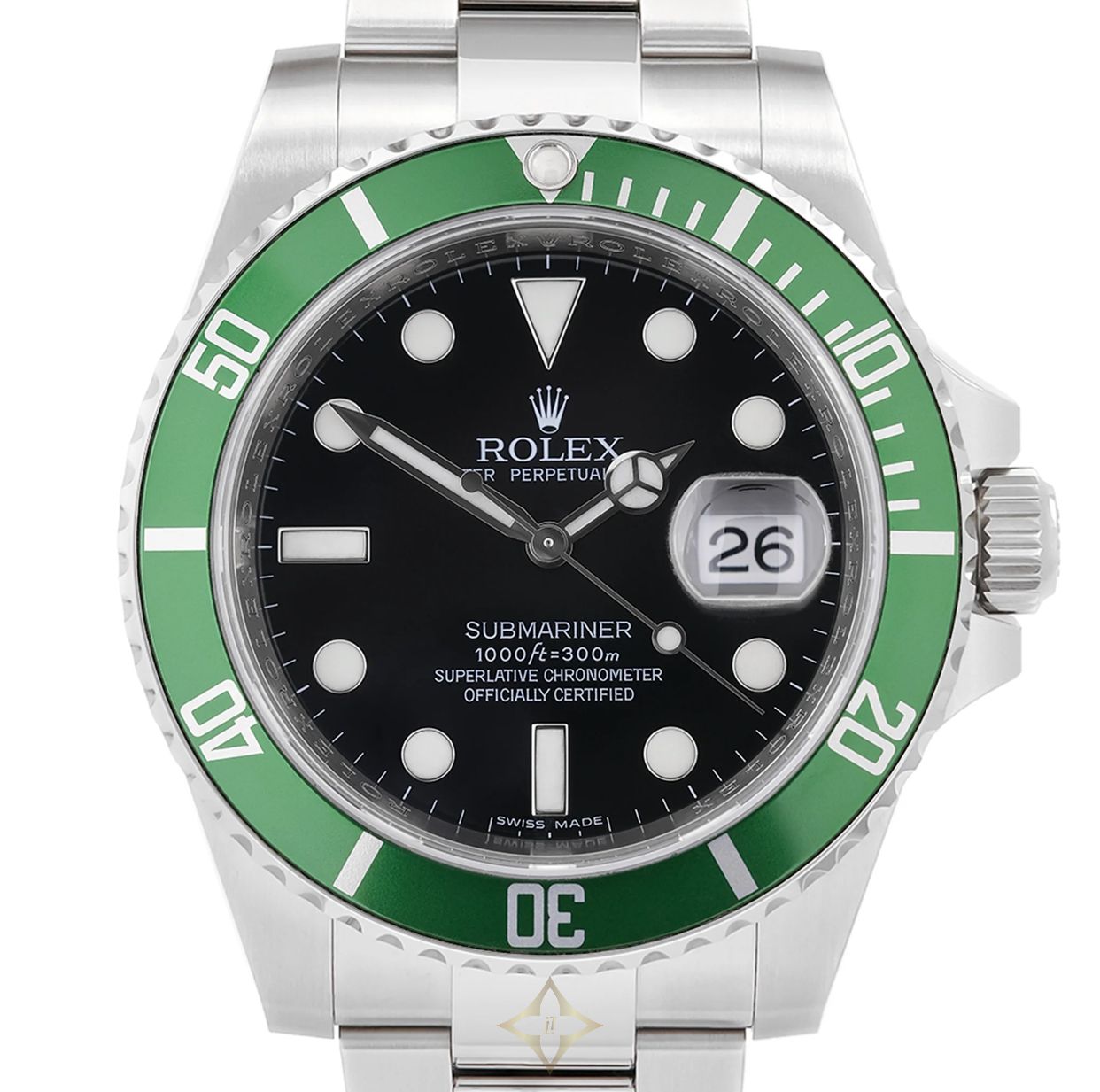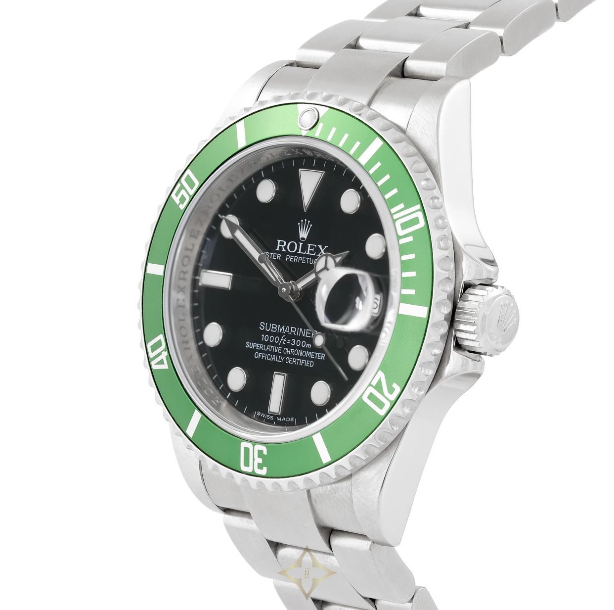 A Rolex Submariner 50th Anniversary 'Kermit' ref. 16610LV. This watch features a 40mm stainless steel case with a green aluminium bezel and black dial. The watch is fitted with a stainless steel Oyster bracelet complete with an Oysterlock clasp.