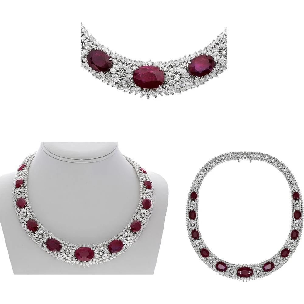 gift of light, luxury, and timeless beauty, this exquisite Diamond & Ruby Collar Necklace commands attention with its breathtaking design. A brilliant symphony of sparkling diamonds and vibrant rubies, this masterpiece is a true statement of elegance and sophistication. Set in radiant 18K white gold, the necklace features a stunning array of oval-cut rubies, each one surrounded by a dazzling halo of round diamonds, which catch the light with every movement. The intricate detailing of the setting and the fine milgrain accents elevate its charm, creating a piece that feels both contemporary and classic.