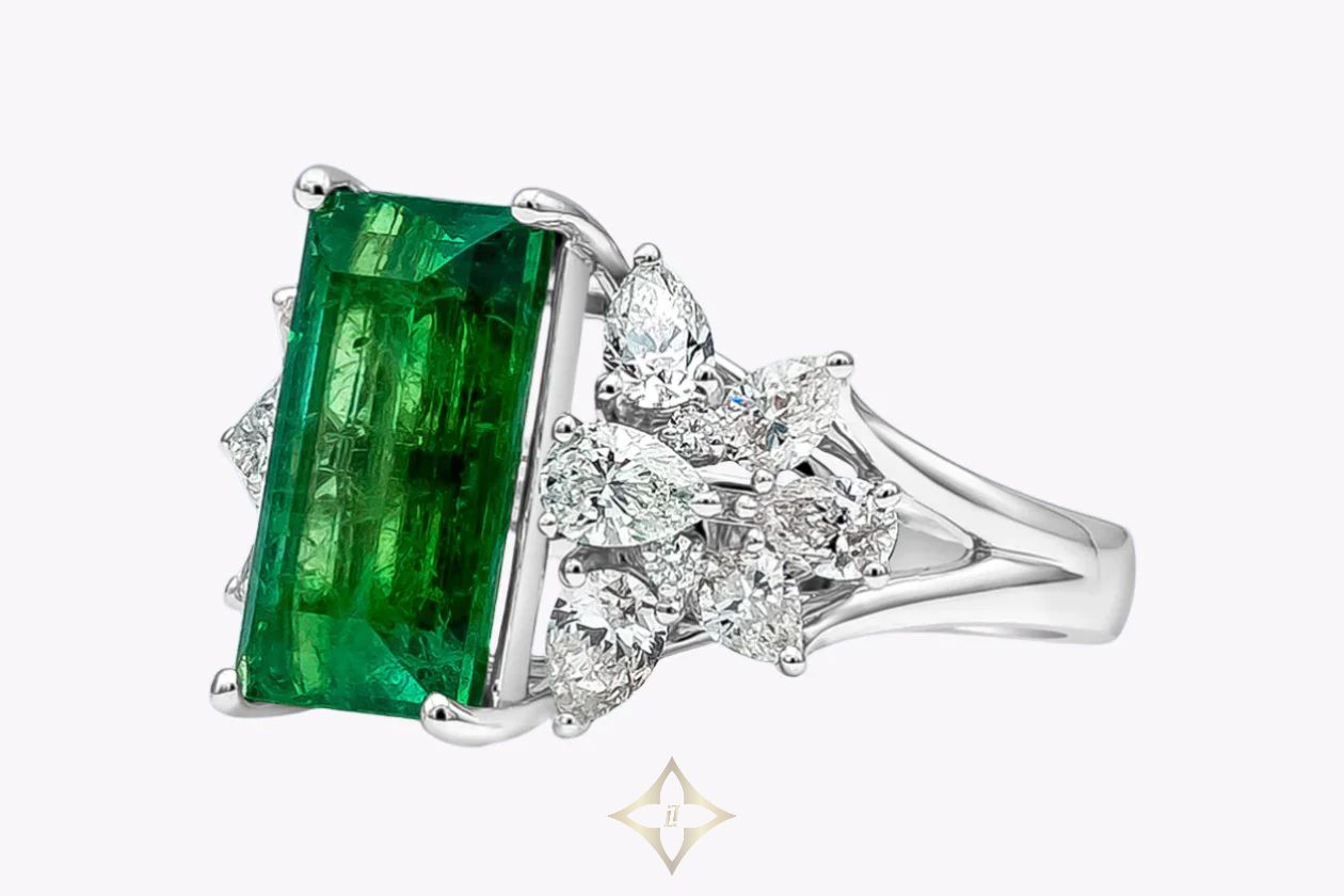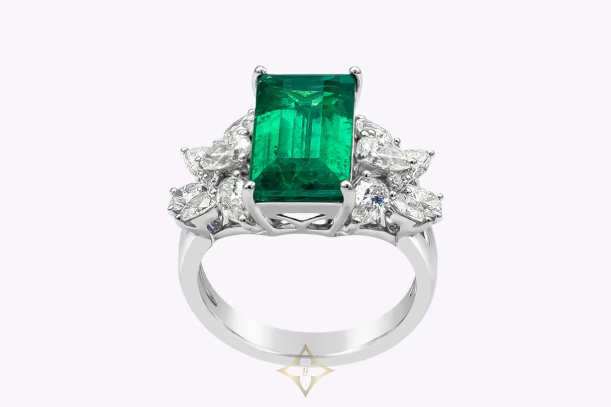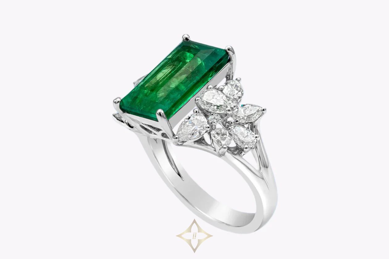 5.40 Carats Baguette Cut Colombian Emerald & Diamond Cocktail Ring in White Gold
