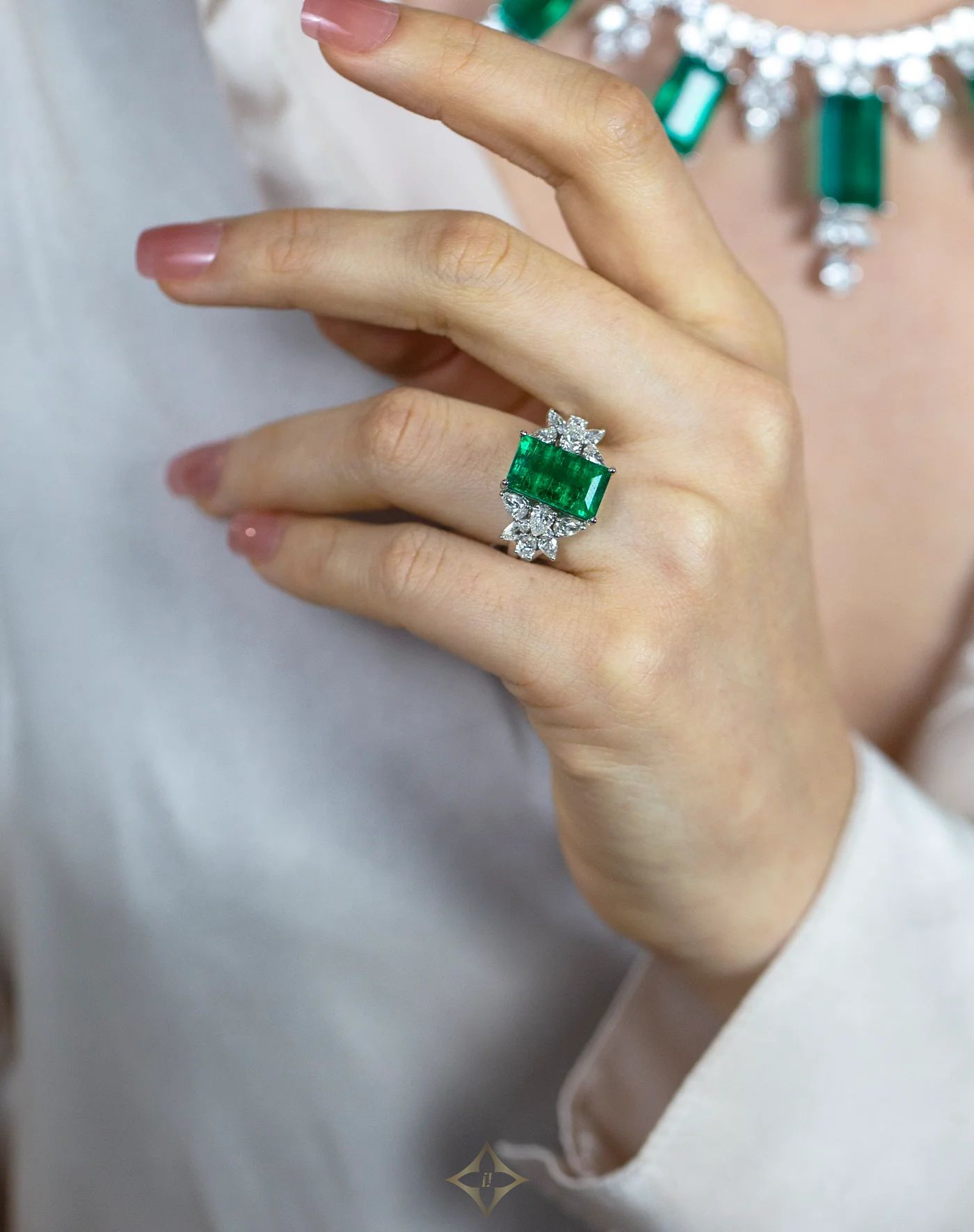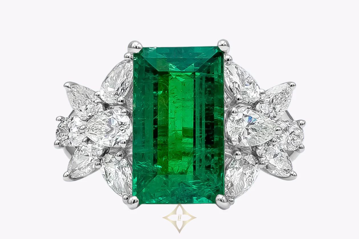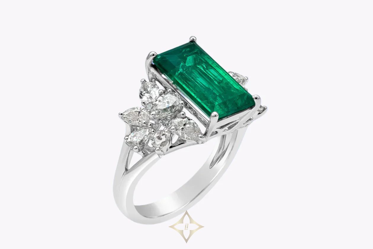5.40 Carats Baguette Cut Colombian Emerald & Diamond Cocktail Ring in White Gold