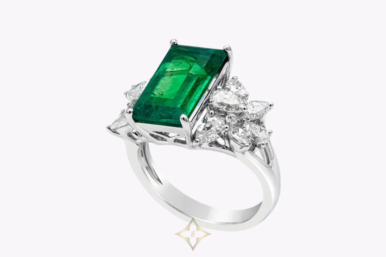 A high-end fashion ring, featuring a GRS certified 5.40 carats baguette cut emerald, set on a four prong setting. Accented by 12 pear shape diamonds weighing 1.99 carats total and 4 bright round cut diamonds weighing 0.05 carat total. Accent diamonds are G color and VS-SI clarity. Finely set on a semi split-shank 18K white gold mounting. Size 6 US, resizable upon request.