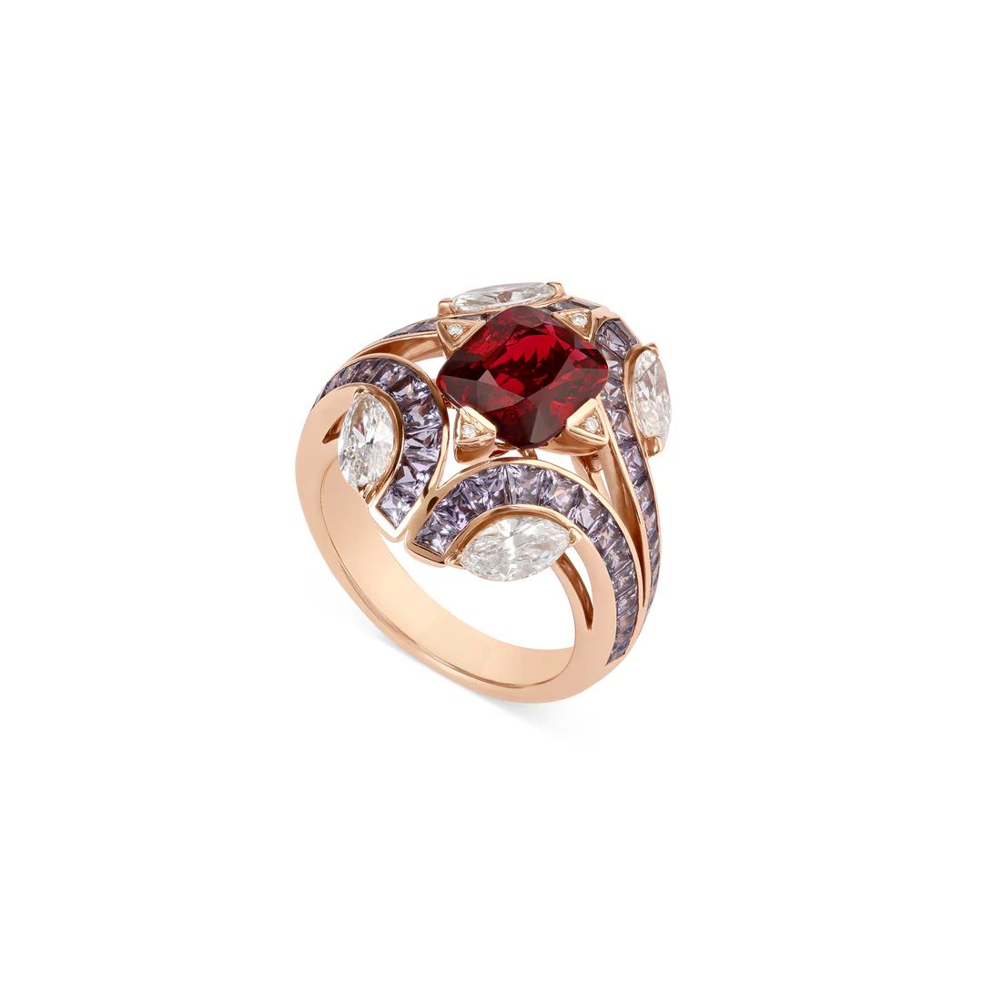 Gemstone: Features a vivid natural spinel, admired for its intense color and rarity.