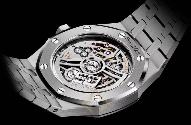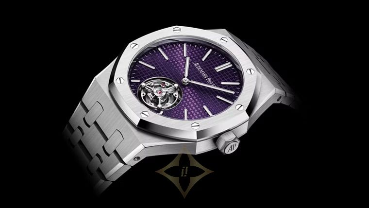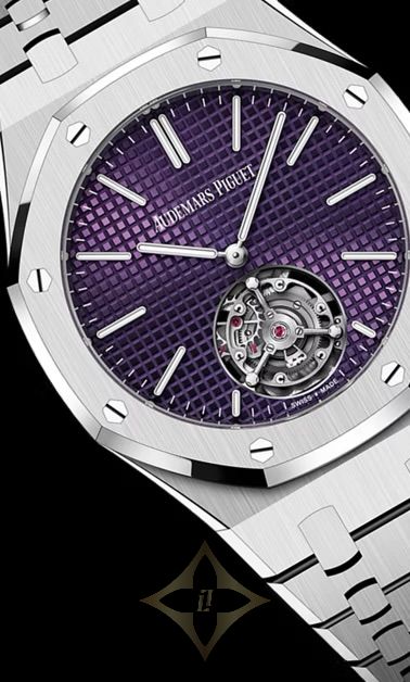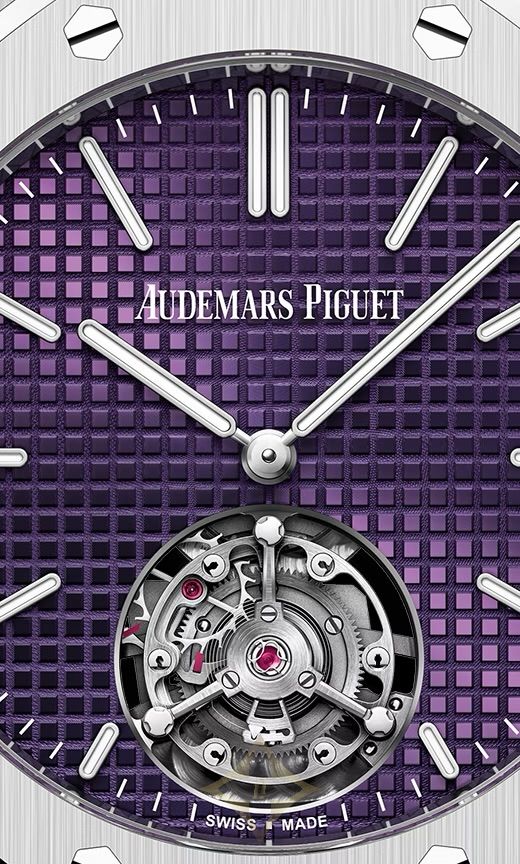 This extra-thin 37 mm anniversary Royal Oak, powered by Calibre 2968, embodies the Manufacture's first ever selfwinding flying tourbillon offered in a 37 mm diameter. Endowed with a new plum Petite Tapisserie dial and an innovative escapement system, this stainless steel timepiece blends technical feats with meticulous aesthetic.
