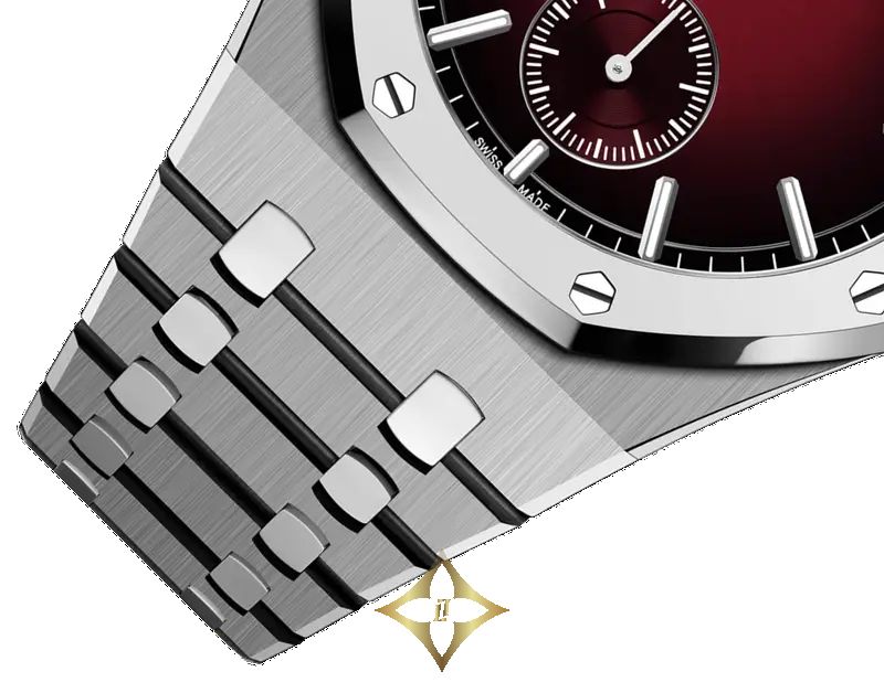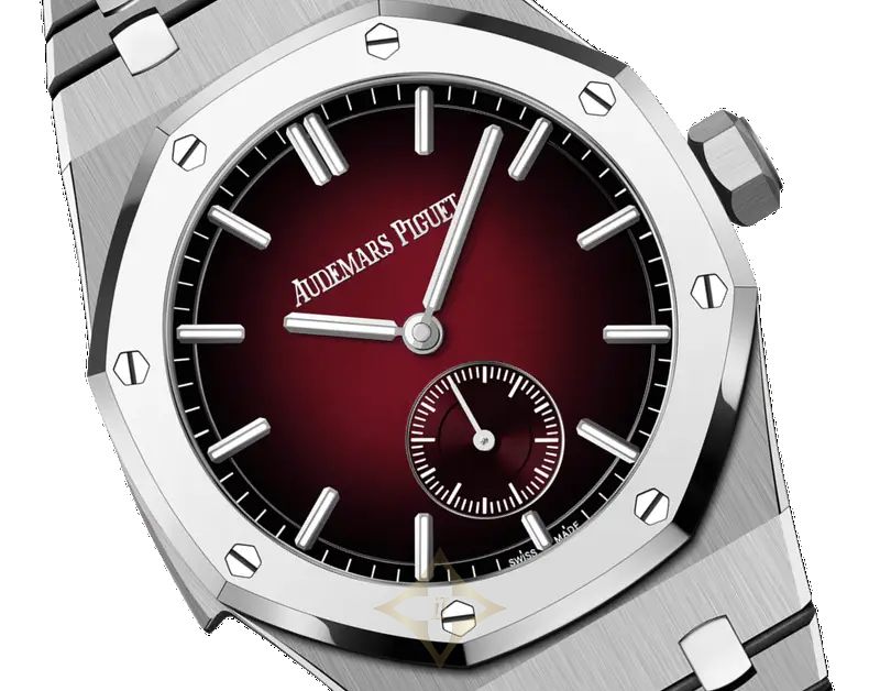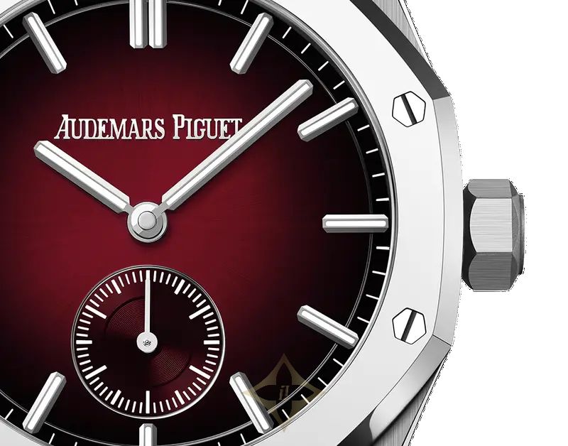 Special smoked burgundy dial, white gold hour-markers and Royal Oak hands with luminescent coating.