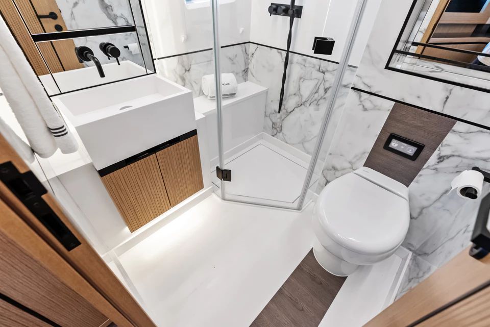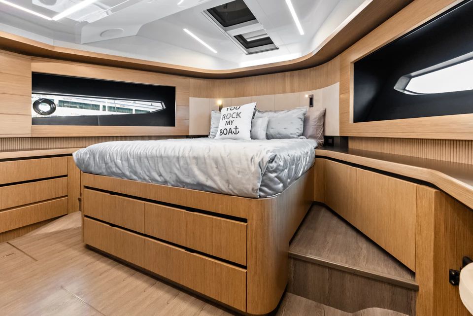 SCOTT FREE sets herself apart in the 60-foot class, effectively replacing the Pearl 60 with greater interior volume and more modern features. A major highlight for her size is a rare 4 stateroom layout which includes a full-beam, midships Owner’s stateroom with a private entrance from the salon. Forward, the VIP suite offers an en-suite, while 2 versatile twin cabins provide flexible accommodation, sharing a head or adaptable layout depending on guest needs.