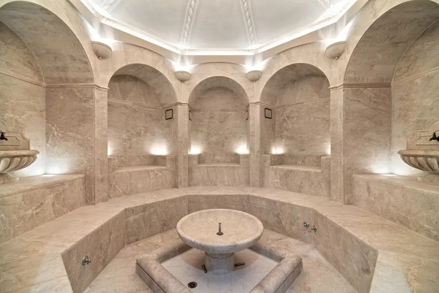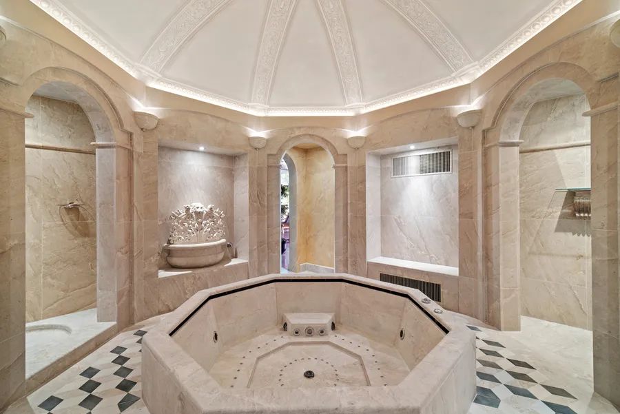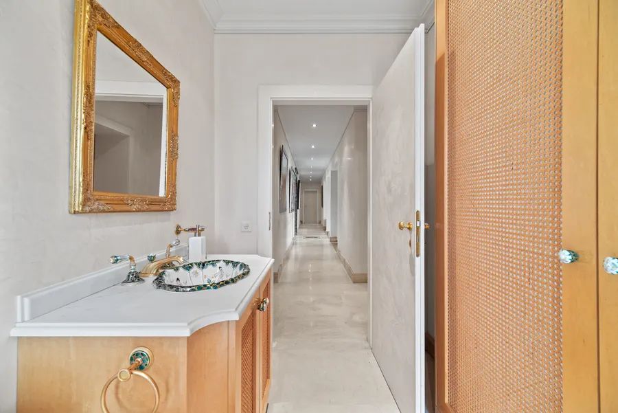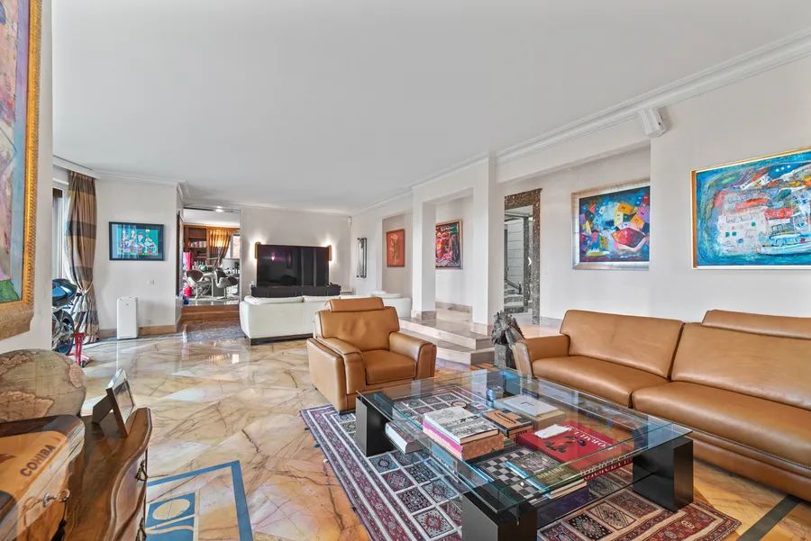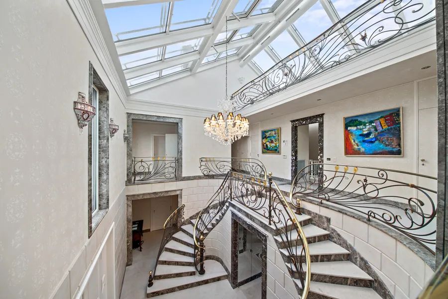 The marble main entrance features an ornamental double staircase with very high ceilings and exceptional light from the glass roof.