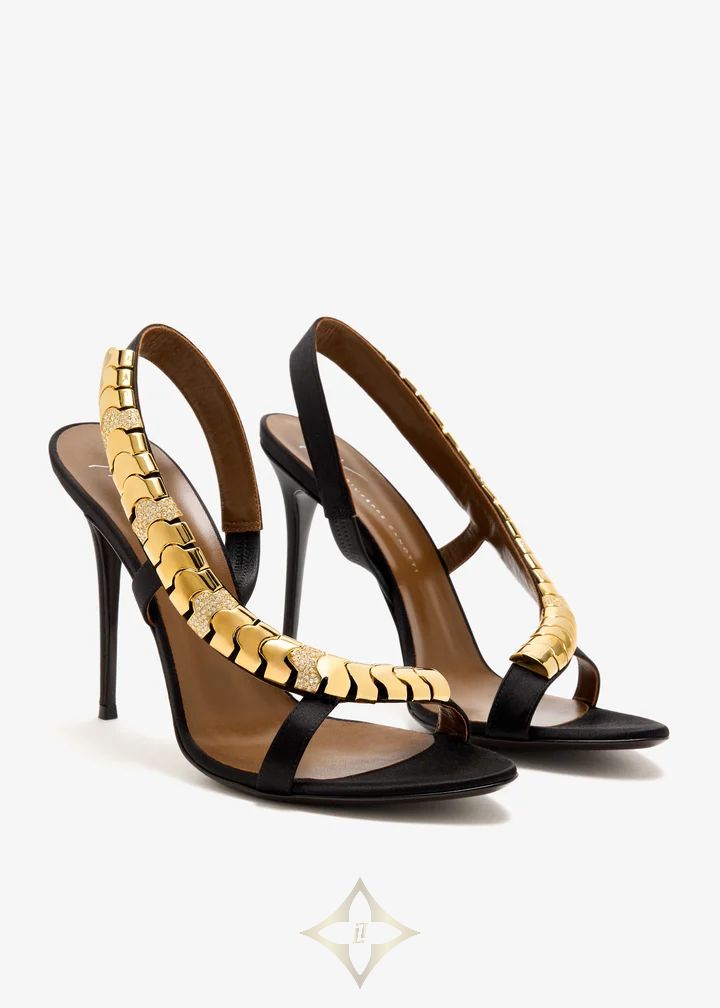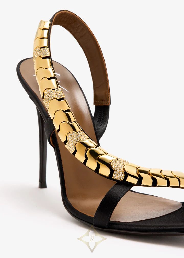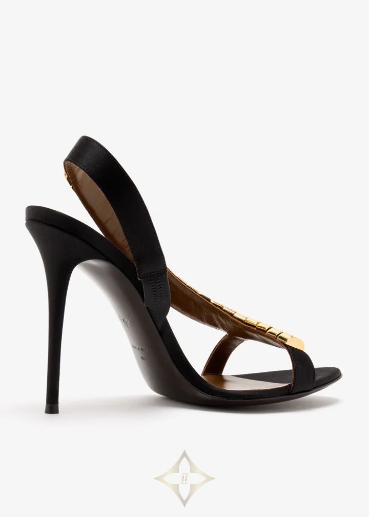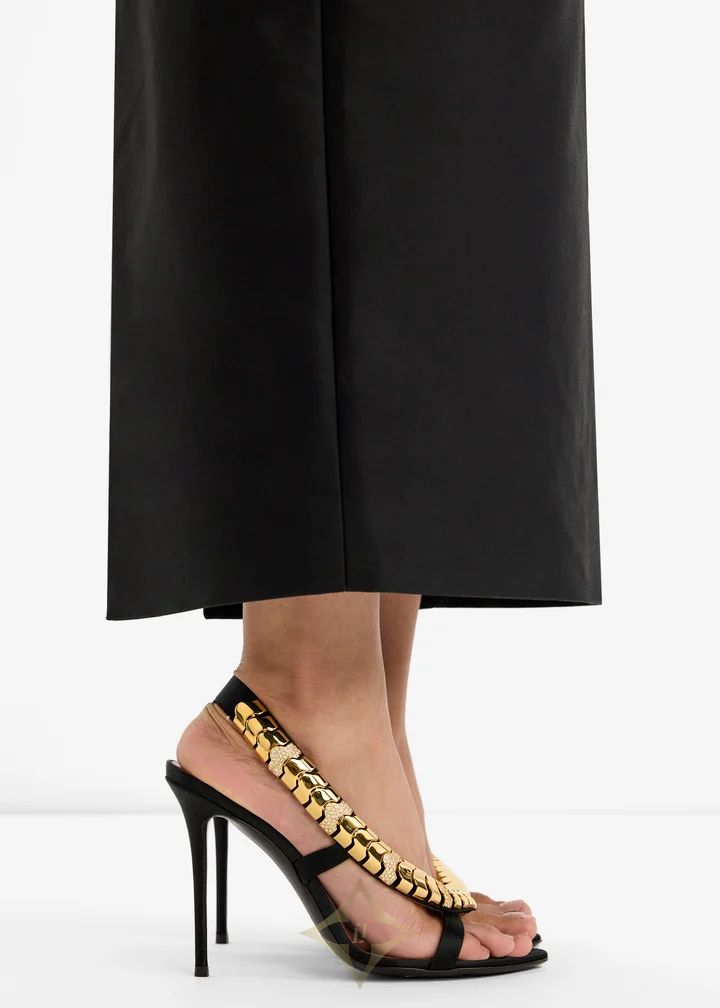 Sculptural gold hardware cascades down the arch of these black slingback sandals, adding a touch of high-gloss glamour to a classic silhouette. A barely-there front strap and stiletto heel balance opulence with elegance.