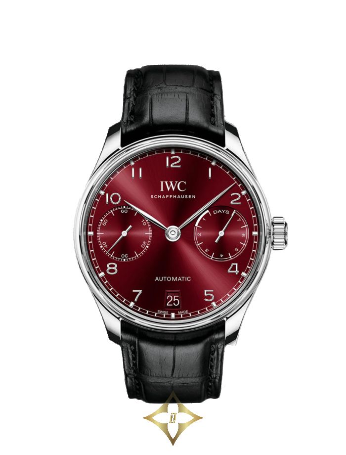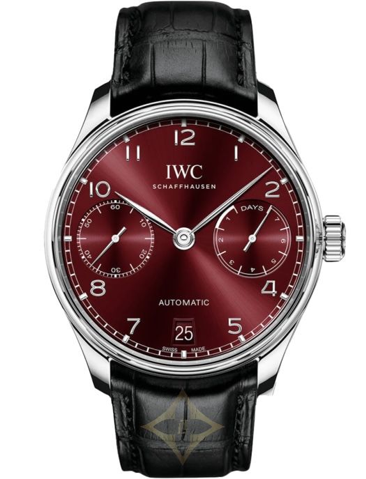With a characteristic minutes scale, appliquéd Arabic numerals, and slender feuille hands, the Portugieser Automatic expresses the iconic Portugieser design very effectively. The small seconds and the power reserve display are located directly opposite each other at "3 o’clock" and "9 o’clock", which results in a very balanced dial design. This model features a stainless-steel case, a burgundy dial, as well as rhodium-plated hands and appliqués. Ensuring a precise rate is the IWC-manufactured 52010 calibre. The automatic Pellaton winding system features components made of virtually non-wearing ceramic and builds up a power reserve of seven days in two barrels. The decorated movement is visible through a transparent sapphire-glass back. The timepiece is fitted with a black alligator leather strap.