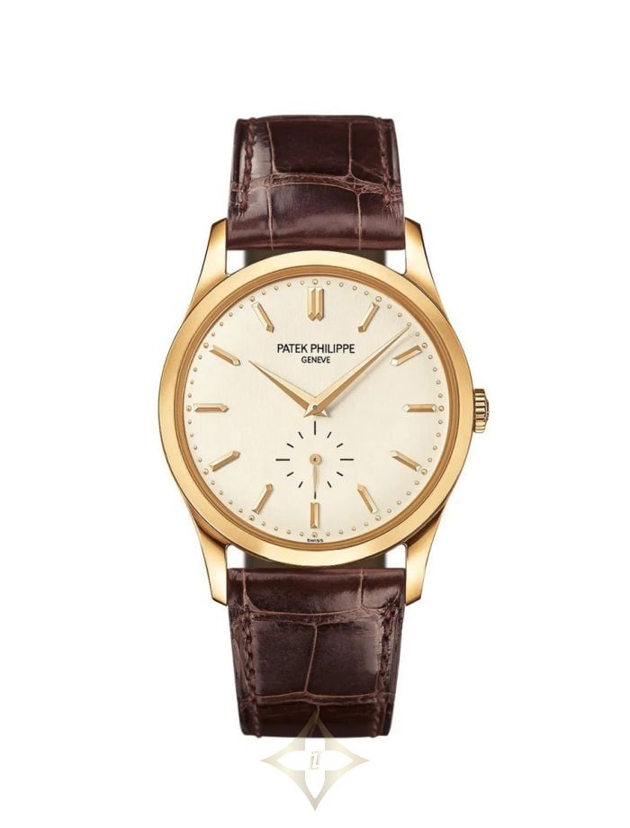 Pre-owned Patek Philippe Calatrava. This timepiece features a 37mm 18ct yellow gold case paired with a classic silver dial. It is powered by the self-winding mechanical Calibre 215 PS movement. The watch is completed with a rich brown leather strap and secured with an 18ct yellow gold tang buckle. Includes box and papers.