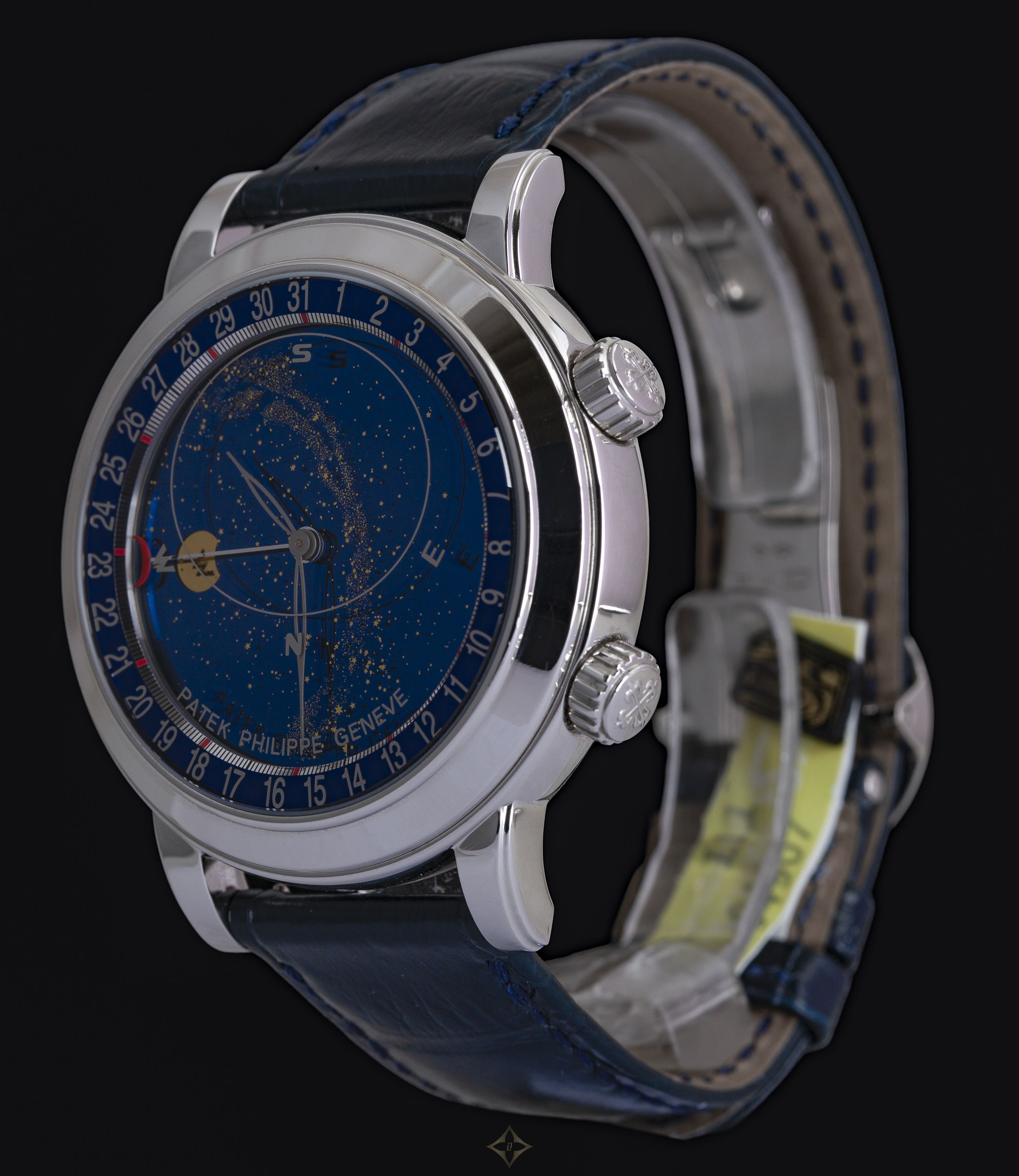 Patek Philippe Celestial reference 6102P-001 with box and papers in mint condition. This masterpiece made of platinum is one of the most spectacular astronomical complications of the manufactory. The deep blue dial shows a rotating sky map with the constellations of the northern hemisphere, the course of the phases of the moon, and the movement of the sky vault in real time - a fascinating spectacle that combines the fascination of watchmaking with the infinity of the cosmos. The 44 mm platinum case gives the watch an impressive presence, while the interplay of technology and poetry makes the reference 6102P one of the most extraordinary models in the modern Patek Philippe collection. A top-class collector's item for lovers of astronomical complications and an expression of the highest watchmaking.