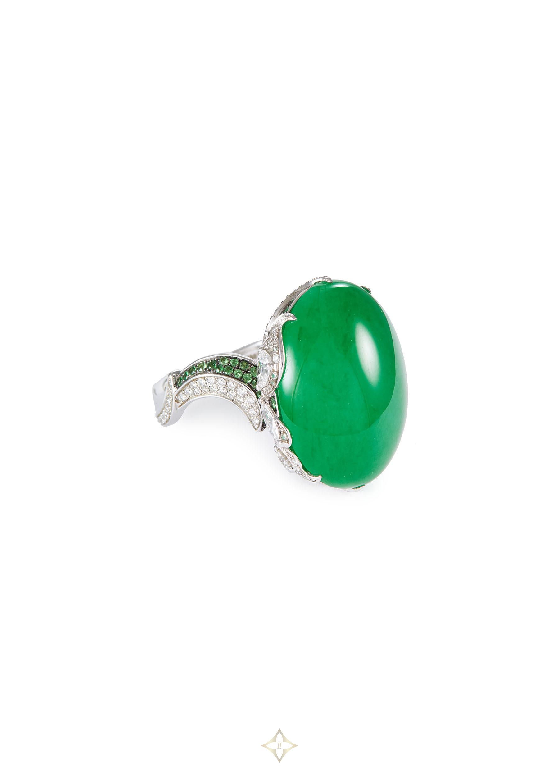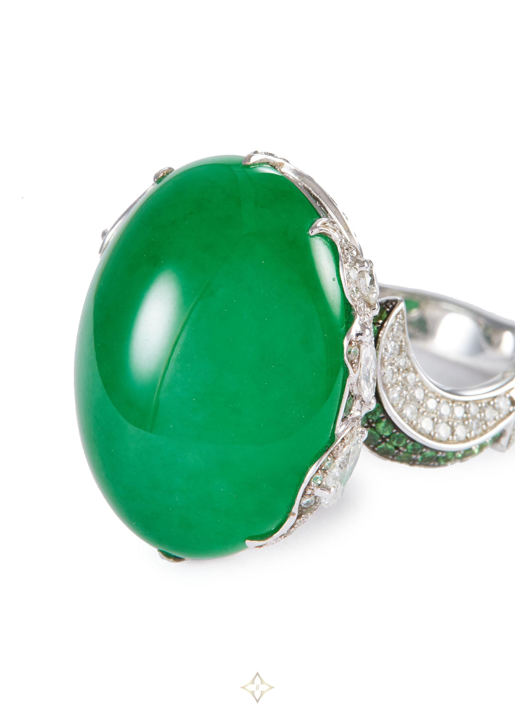 Samuel Kung's East-meets-West designs instantly captivate the eye, as showcased in this ring. Set with a vibrant green jade, this piece is framed by white diamond and green garnet pavé.