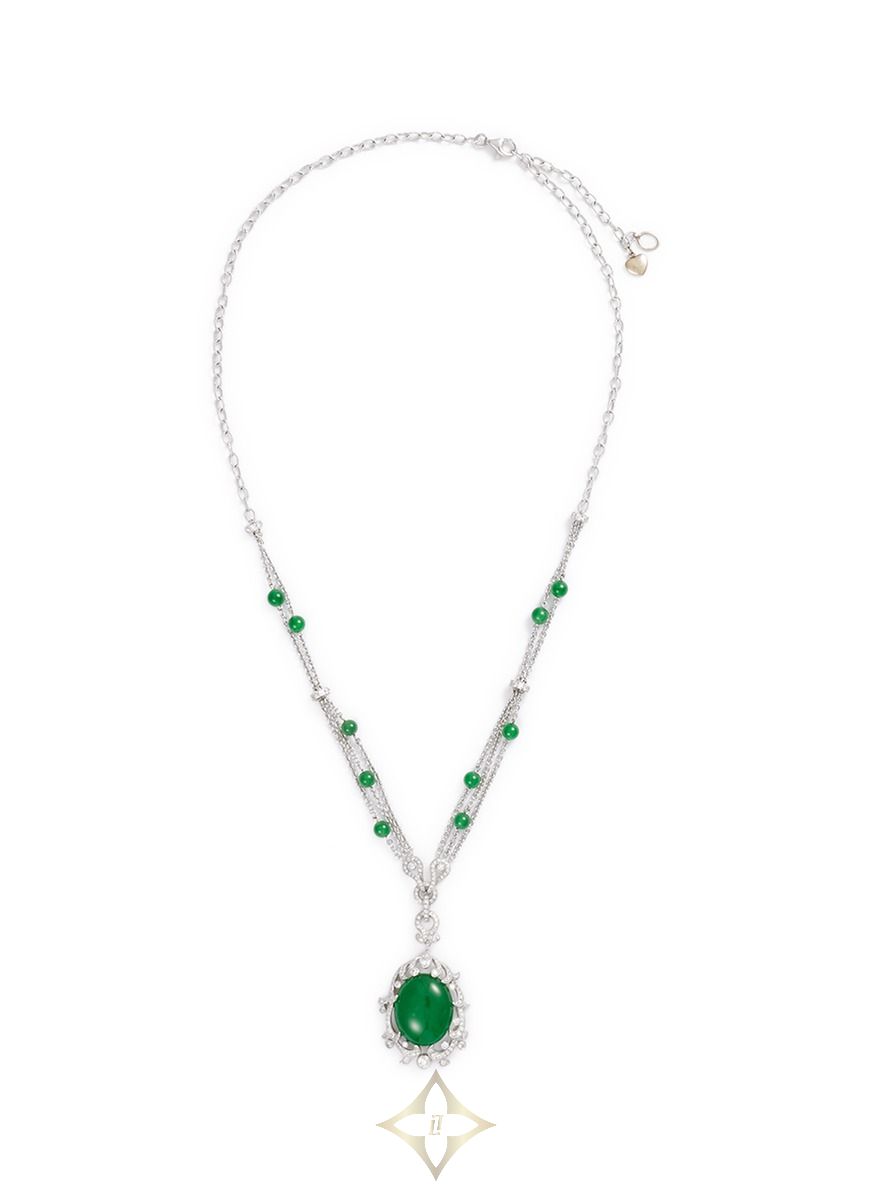 Samuel Kung takes a modern approach to present the traditional beauty of jades through this necklace. Beautifully mounted with green jades, this stunning piece is elegantly flourished with white diamonds.