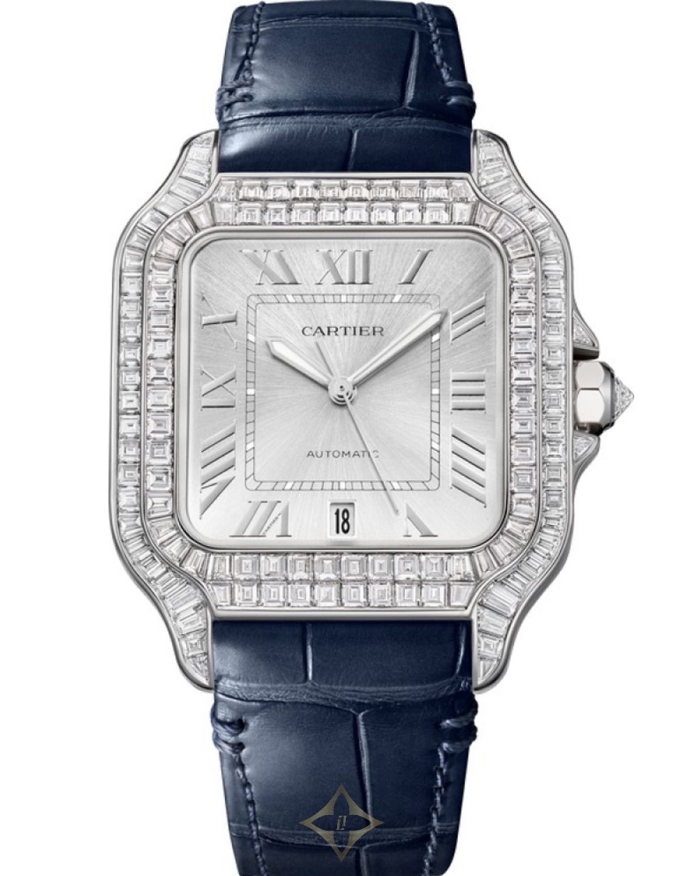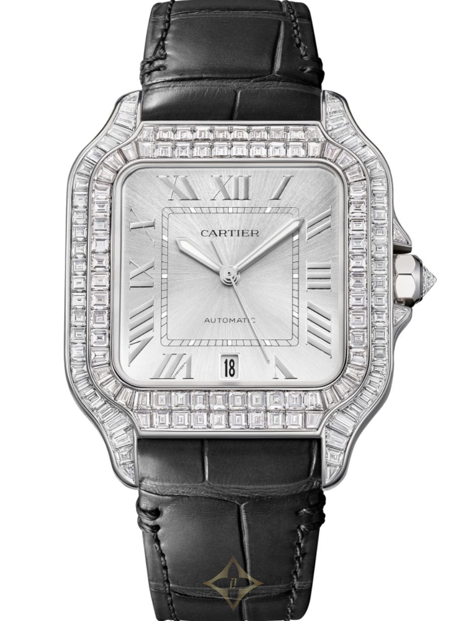 Santos de Cartier watch, large model, mechanical movement with automatic winding, 1847 MC. Rhodiumized 18K white gold (750/1000) case set with 126 baguette-cut diamonds totaling 5.90 carats, rhodiumized 18K white gold (750/1000) crown set with a brilliant-cut diamond. Silvered dial with sunray-effect, silvered Roman numeral hour-markers, white Super LumiNova® on the rail track and steel sword-shaped hands, sapphire crystal. Interchangeable gray alligator leather strap, second interchangeable strap in navy blue alligator leather, rhodiumized 18K white gold (750/1000) ardillon buckle set with 28 baguette-cut diamonds totaling 1.10 carats. Case dimensions: 47.5 x 40 mm, thickness: 9.1 mm. Water-resistant up to 3 bar (approx. 30 meters/100 feet)