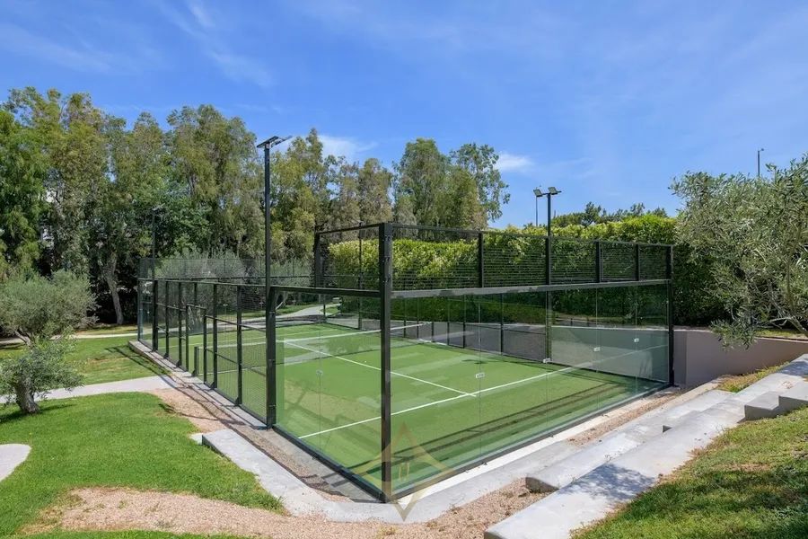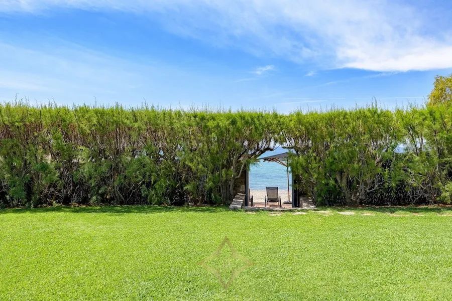 The villa is situated in a sloping land plot of 7,700 sqm in total, which is landscaped in beautiful lawn areas, flower beds and cobblestone pathways, surrounded by tall trees, ensuring quiet and privacy. The plot also includes 500 sqm of exclusively organic cultivation, a 131 sqm swimming pool surrounded by wooden deck and a smaller one, private to the master bedroom, tennis court, mini soccer field, covered parking space and large patios. On the fencing wall of the property there is a door giving immediate access to the beach.