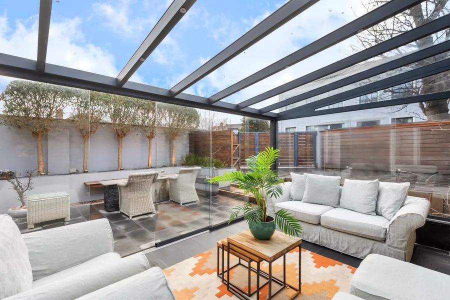 Pedestrian access leads into the front garden, while to the rear lies a low-maintenance landscaped garden featuring raised beds planted with mature 35-year-old Olive trees. A designated seating area with a gas fireplace provides the perfect setting in which to enjoy the glorious south-west orientation, while a bespoke outdoor kitchen area makes ‘Al fresco’ entertaining effortless. A glazed garden room is a valuable additional living space and is the ideal setting to enjoy the garden and outdoor surroundings throughout the year.
