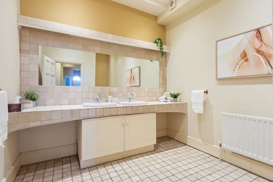 twin wash hand basins inset in vanity unit with storage beneath, vanity mirror and light over, recessed lighting, tiled floor.