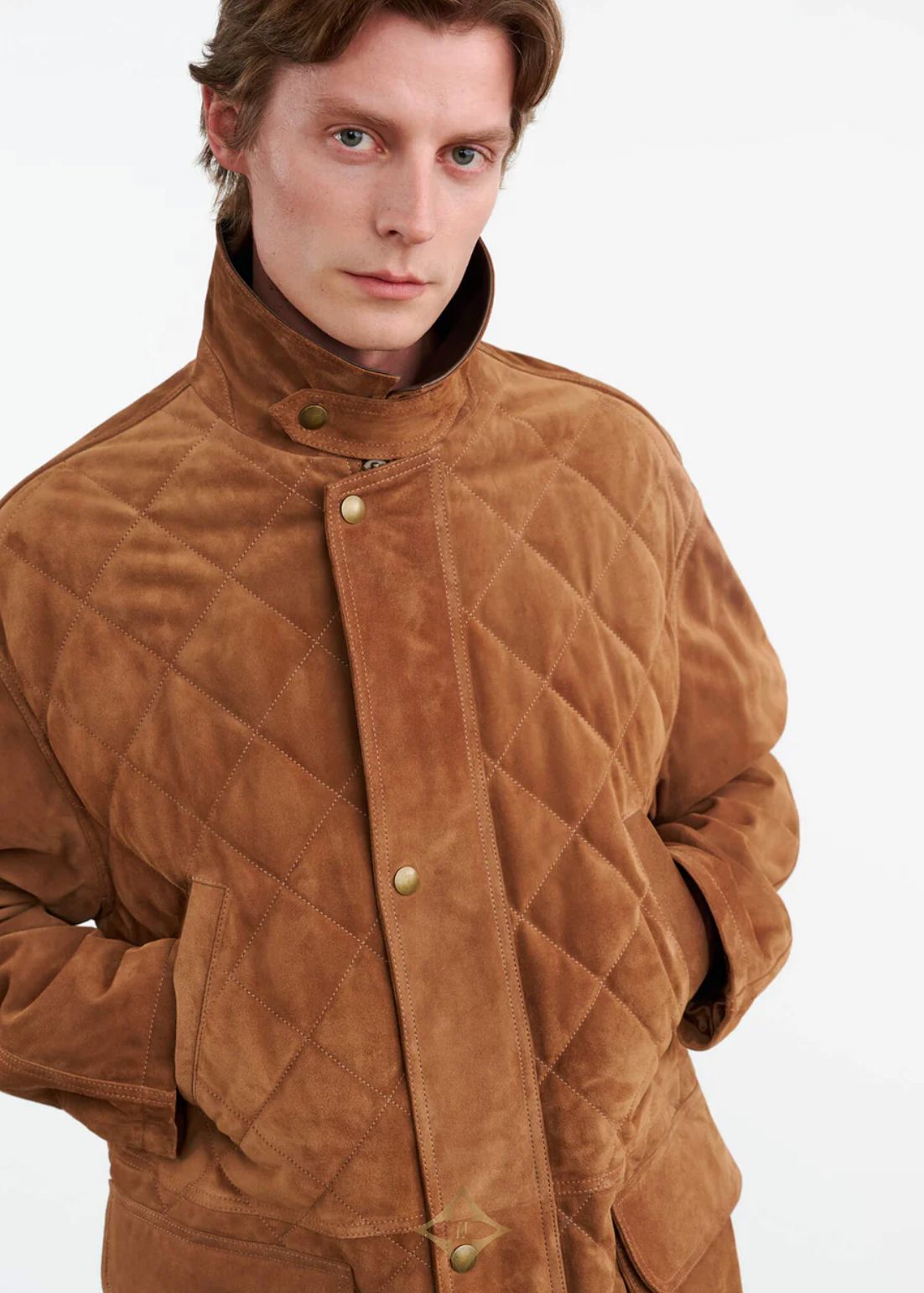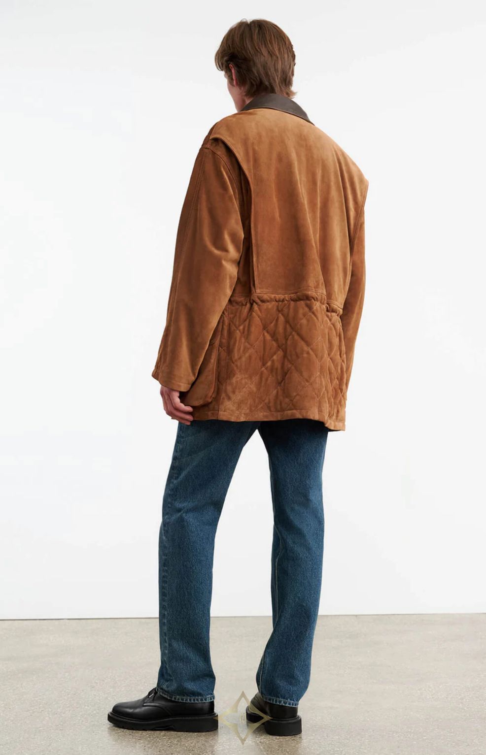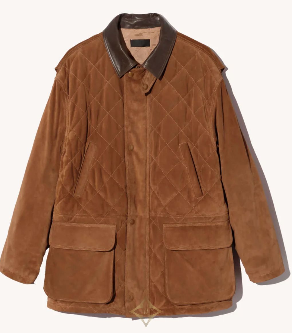 Oversized parka coat in Italian suede and leather. Quilted front. Antique brass snap closure. Slant welt pockets. Adjustable drawstring with logo cord. Leather combo collar. Flange detail. Interior pocket. Fully quilted lining.