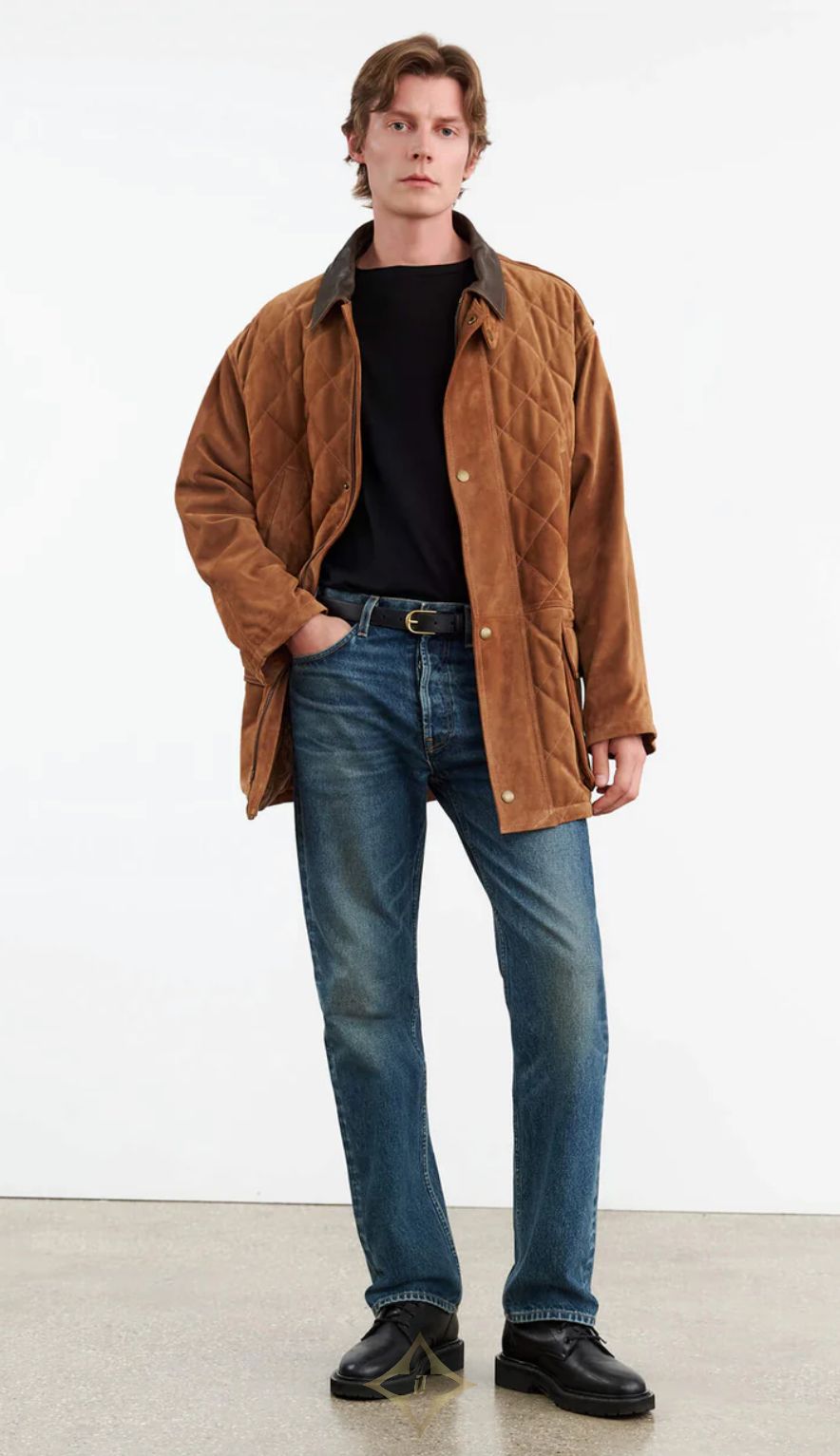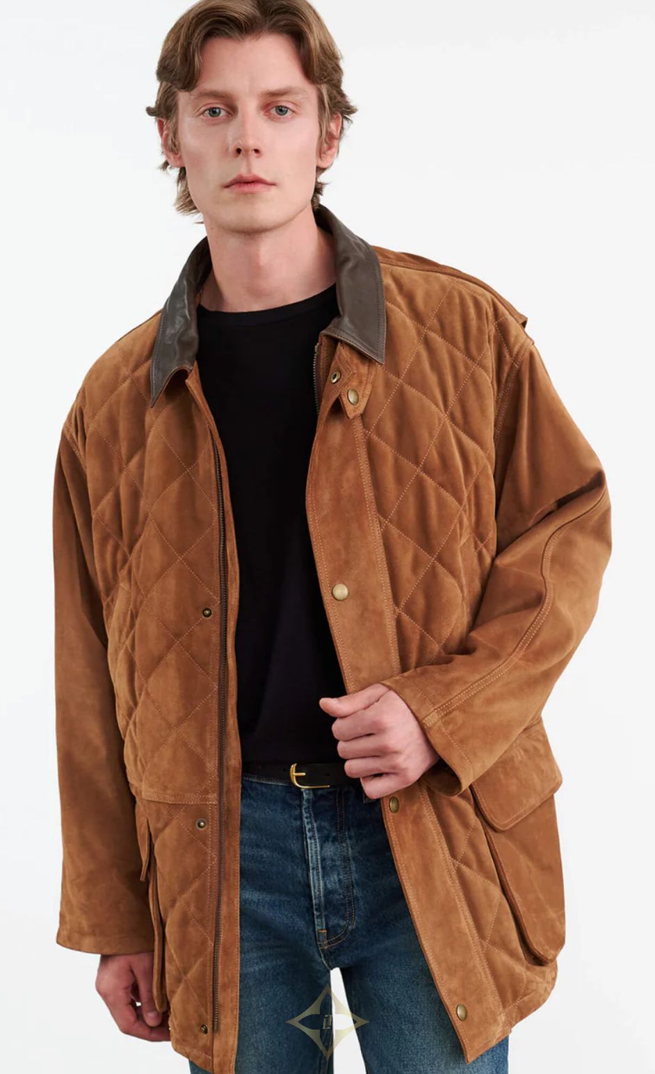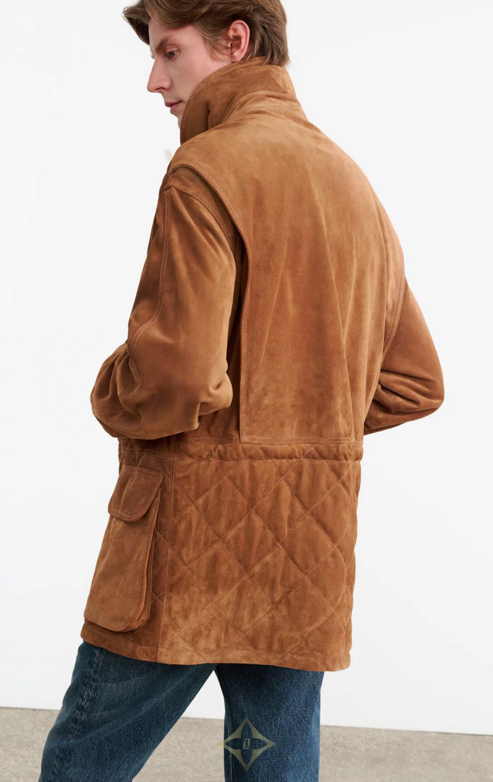 Oversized parka coat in Italian suede and leather. Quilted front. Antique brass snap closure. Slant welt pockets. Adjustable drawstring with logo cord. Leather combo collar. Flange detail. Interior pocket. Fully quilted lining.