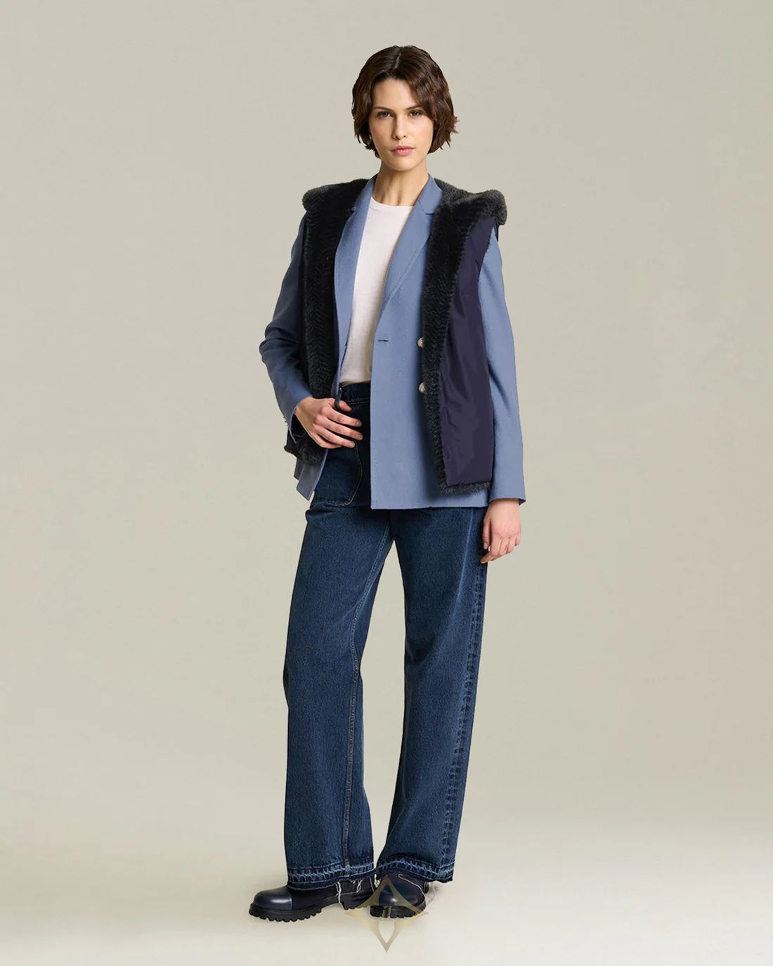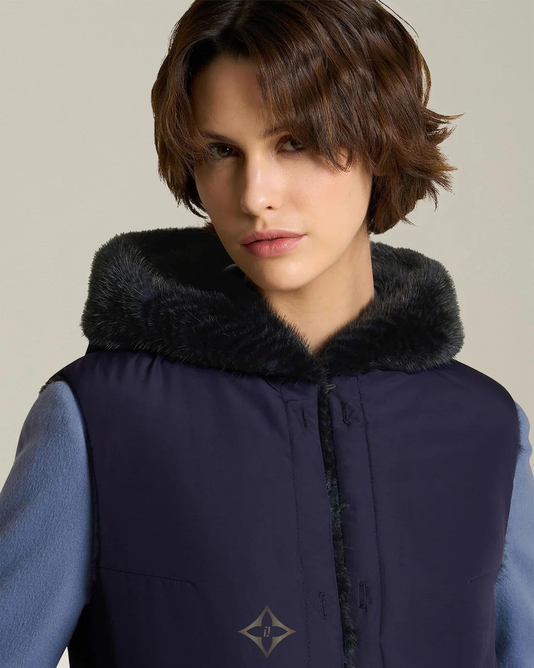 Elegance and practicality define the luxurious comfort of this reversible sleeveless jacket. The exclusive Finnish short nap wild mink fur, renowned for its thickness, compactness, opacity and softness with a velvety touch, is combined with the distinctive silky feel of selected matt, breathable and waterproof nylon fibres. The jacket features a zip fastening and two vertical zipped pockets. Masterfully crafted in our manufacturing facility in Collecchio, the garment is the result of technical processes that bring out its sartorial soul.