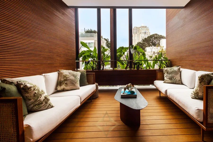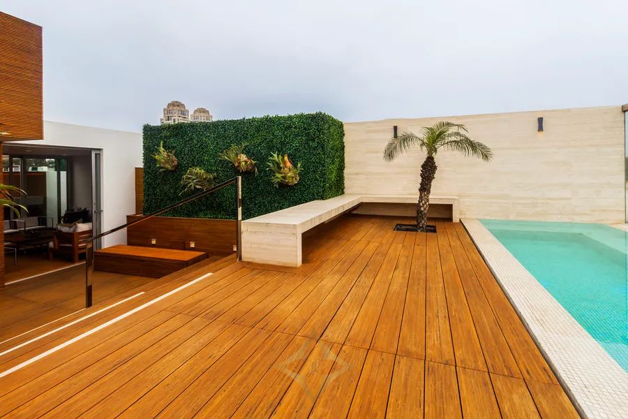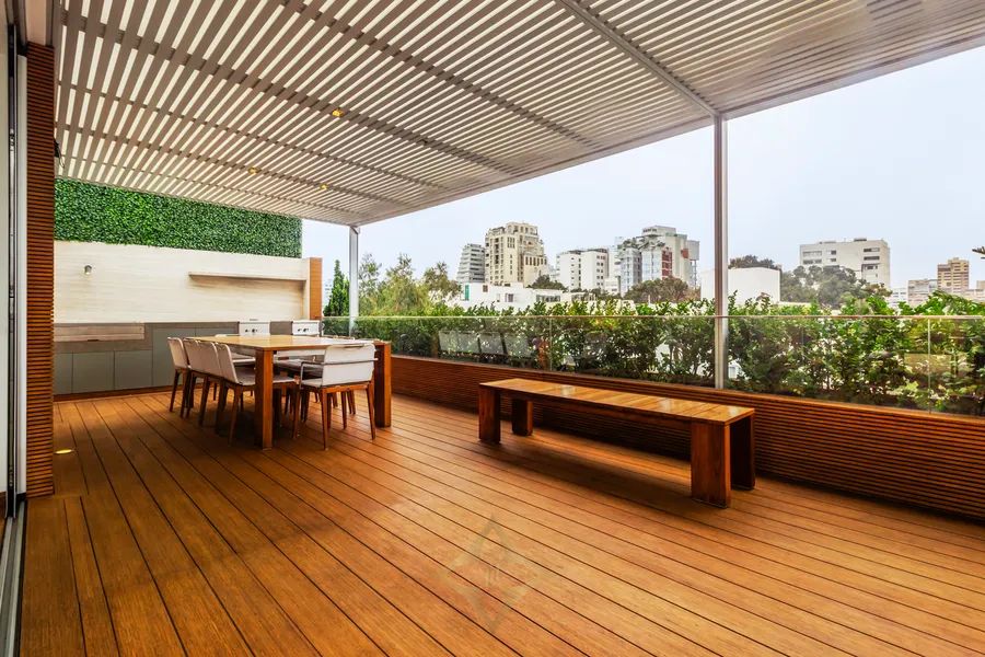 The social area of the apartment includes a large covered terrace, swimming pool, deck, bar, grill, and an additional living room to enjoy soccer games.