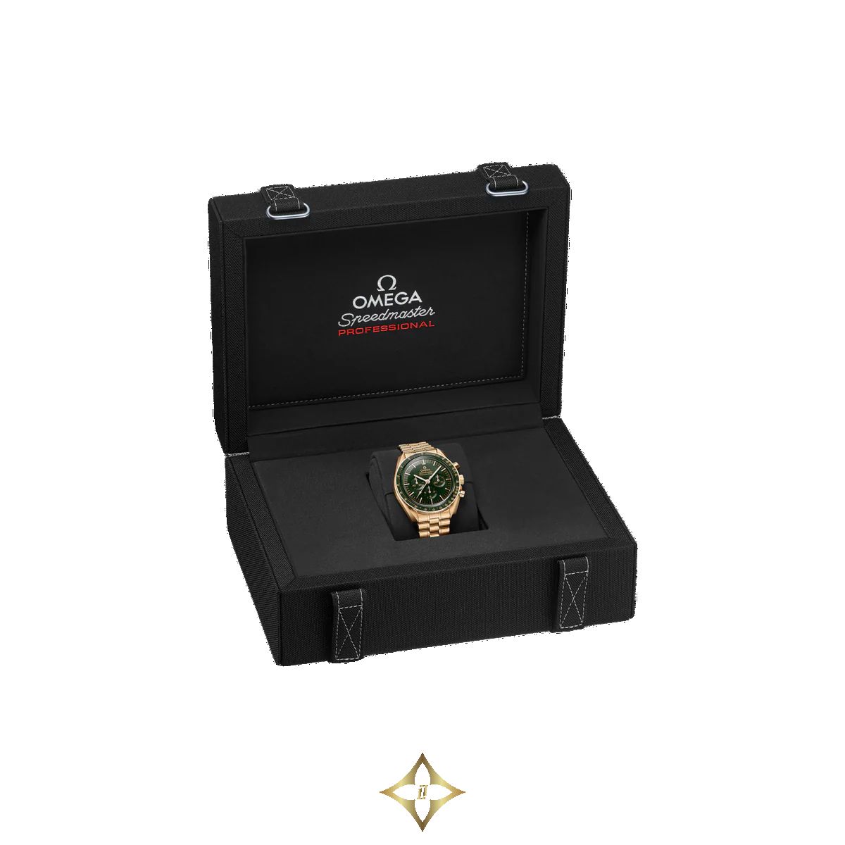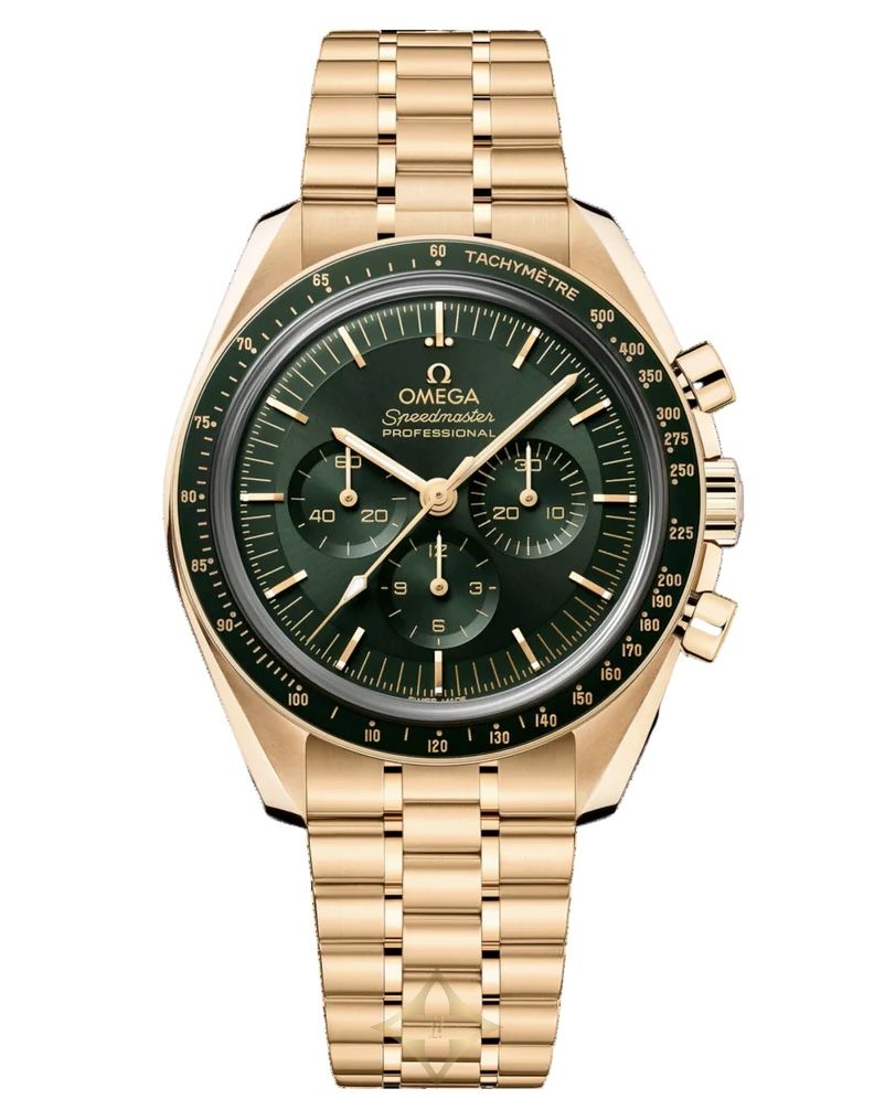Introducing the Speedmaster Moonwatch Professional, featuring a 42mm Moonshine™ gold case and a green dial. Equipped with a manual winding Omega 3861 calibre and a 50-hour power reserve. The scratch-resistant sapphire crystal and 50m water resistance ensure durability.