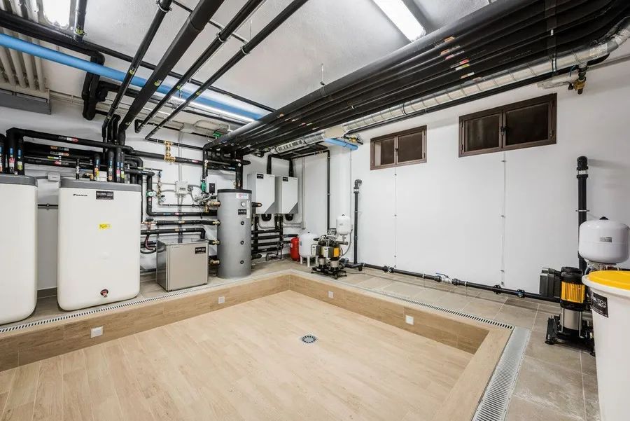 The residence offers a resort-style atmosphere: a heated saltwater pool, a glass pavilion with an outdoor kitchen, a wine cellar, a games room, and a fitness area. The private garage accommodates four cars, ideal for collectors. Advanced smart home technology, underfloor heating, air conditioning, and a lift add convenience and modern elegance.