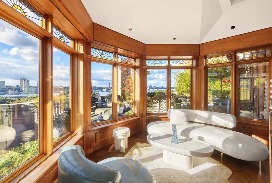 Wrapped in a shimmer of natural light, this residence embodies grandeur, scale, and nuanced design, making it a true gem in the heart of New York City. Situated at the corner of 75th Street and Riverside Drive, this free-standing mansion underwent meticulous renovations in 2022, coupling its grand, old-world heritage and charm to that of modern sophistication. Oversized curved windows and terraces throughout the home enhance the sweeping vistas.
