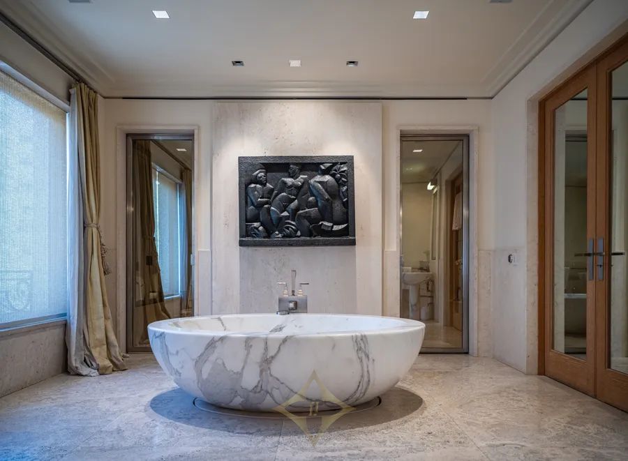 Master suite bathtub (approx. 3 tons) and all bathroom sinks made of single-piece Calacatta marble.
