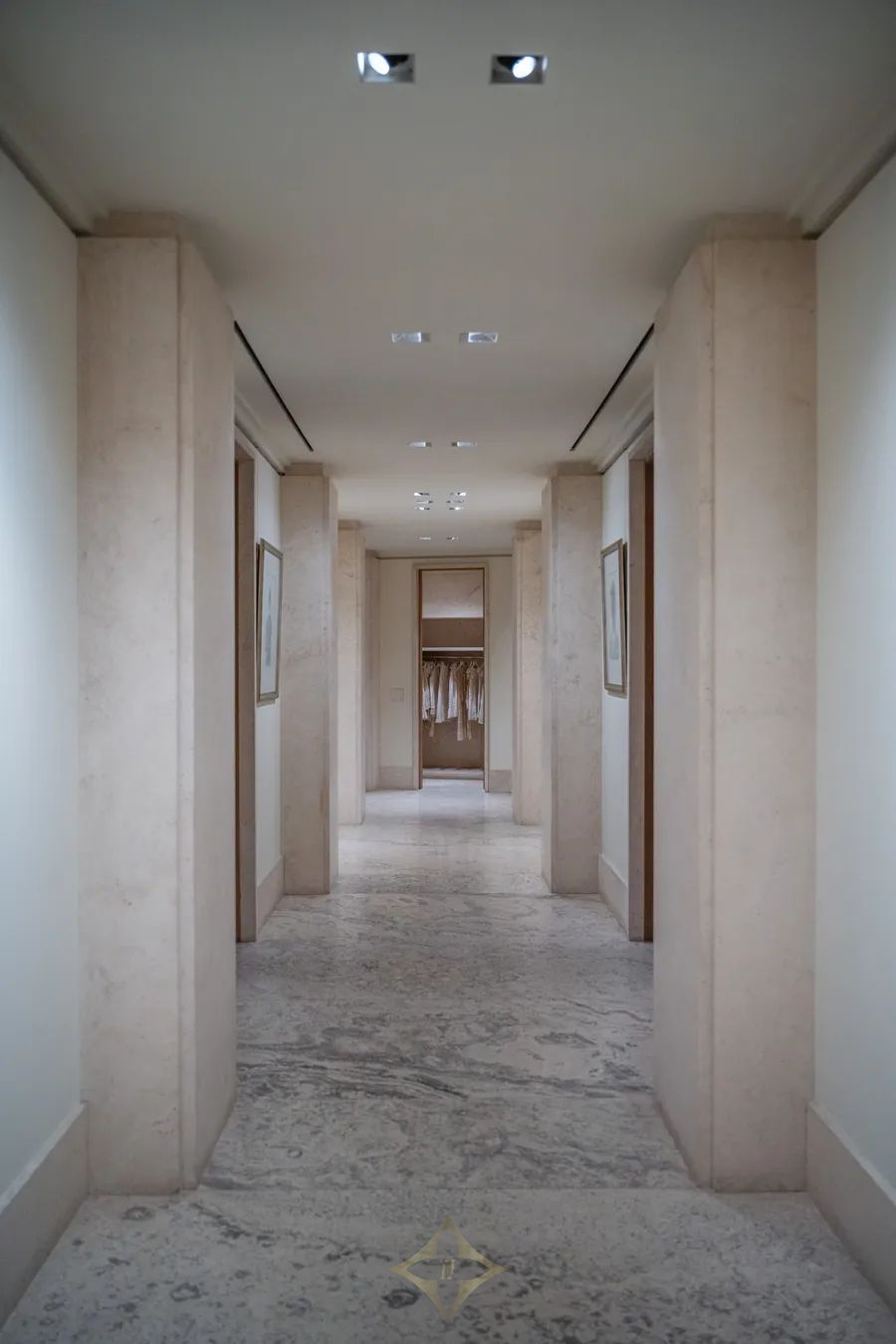 Predominant use of Tivoli Navona travertine throughout.