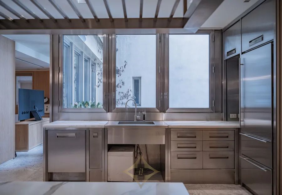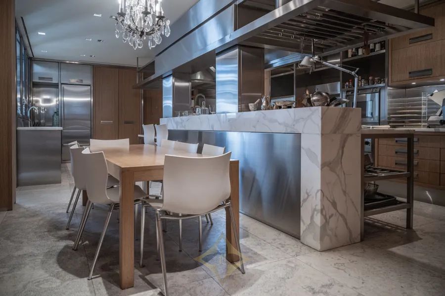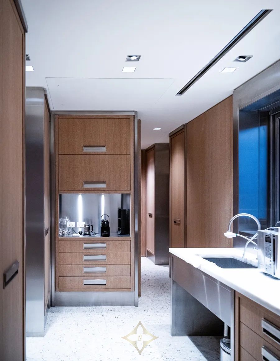 The chef’s kitchen boasts an island integrated with a family dining space and TV lounge. Additional amenities include double staff quarters, laundry room, ironing room, and a 500-bottle wine cellar.