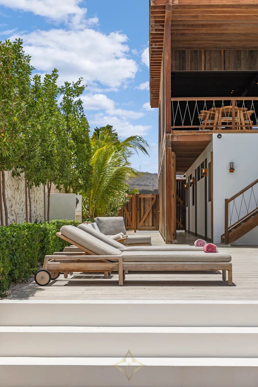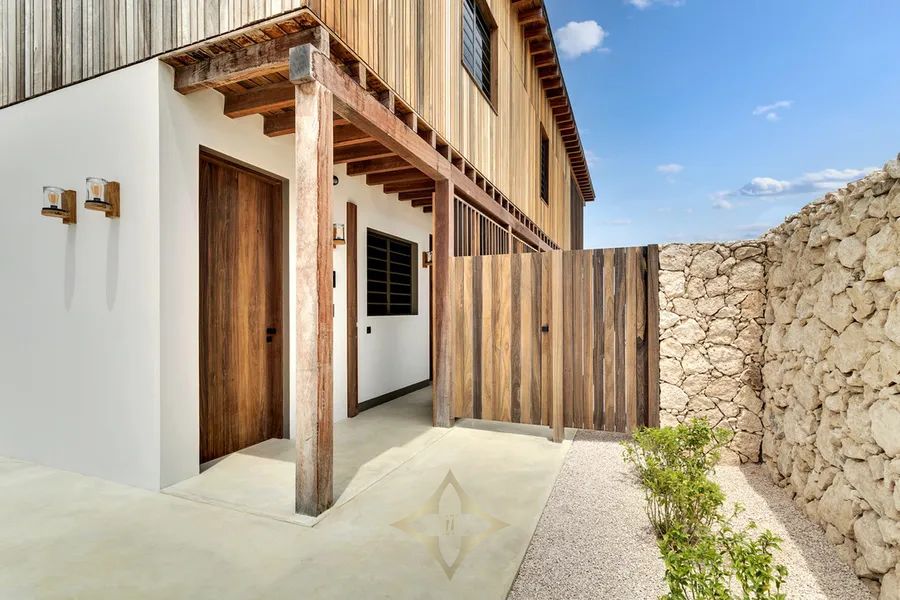 The villas are designed with an environmentally conscious approach, using sustainable materials such as hardwood, local stone, and polished concrete. Every detail has been carefully considered to create an intimate and luxurious living experience. The keyless entrance opens to an open-air hallway on the ground floor, where a separate laundry room with its own exterior entrance allows for discreet housekeeping without disturbing guests. The ground floor houses three spacious double bedrooms, each featuring a king-size bed, air conditioning, ceiling fan, and a private ensuite bathroom with a rain shower and toilet. High-quality cotton linens, pure cotton towels, hairdryers, and hotel safes complete the experience of refined comfort.