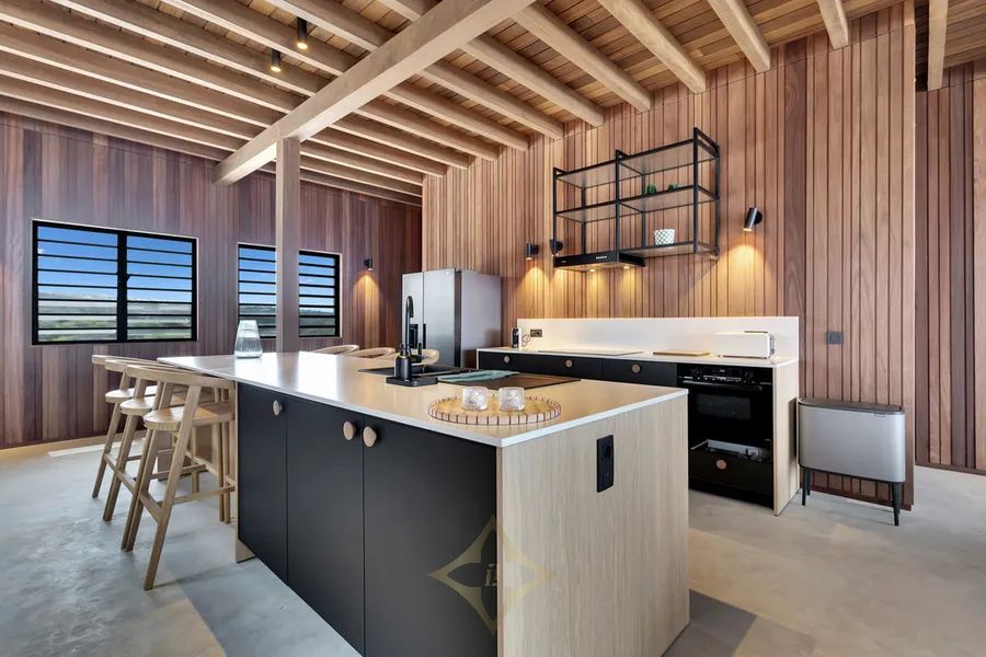 On the first floor, the living area and fully equipped kitchen form the vibrant heart of the villa. Crafted from solid hardwood and finished with polished concrete floors, this space offers a seamless transition between indoor and outdoor living. The comfortable lounge area features a smart TV and a high-end Sonos audio system, while the dining spaces—both inside and outside—invite you to linger over meals with uninterrupted ocean views. The kitchen is equipped with premium appliances, including a dishwasher, induction cooktop, combi oven, Nespresso machine, and more, making entertaining effortless and enjoyable. Behind the kitchen, a second storage and laundry room houses an additional washing machine, providing each villa with two washing machines for added convenience.