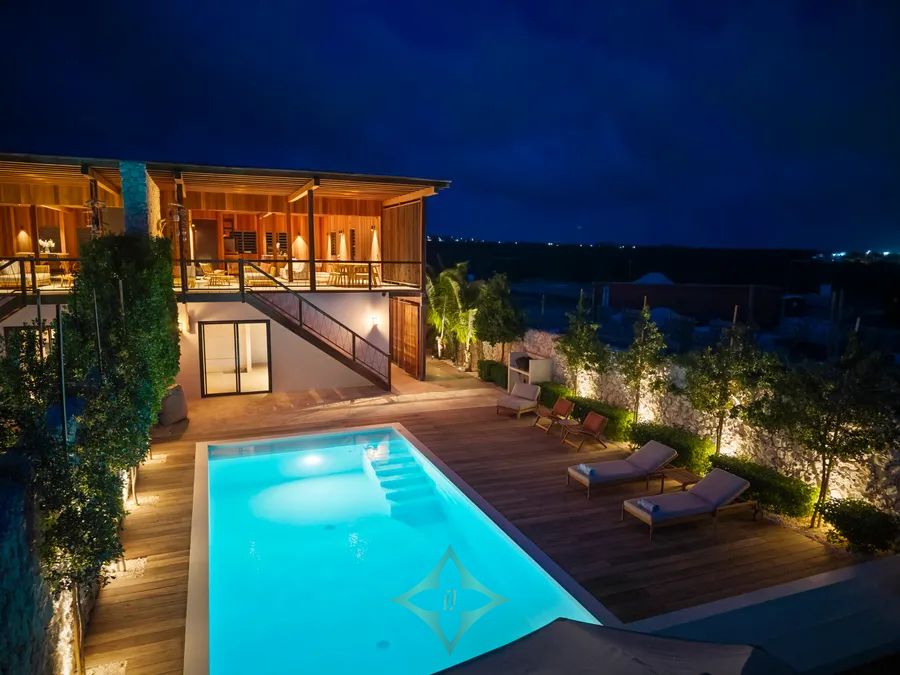 Large sliding windows open fully to a spacious veranda where a dining table and lounge area invite you to relax and take in the stunning Caribbean sunsets. The oceanfront magnesium infinity pool, surrounded by luxury daybeds and shaded lounge areas, offers the ultimate in outdoor living. An outdoor shower, built-in BBQ grill, and dedicated rinse stations for dive and surf gear enhance the experience. Each villa also features a private outdoor storage room, ideal for securely storing equipment and beach essentials.
