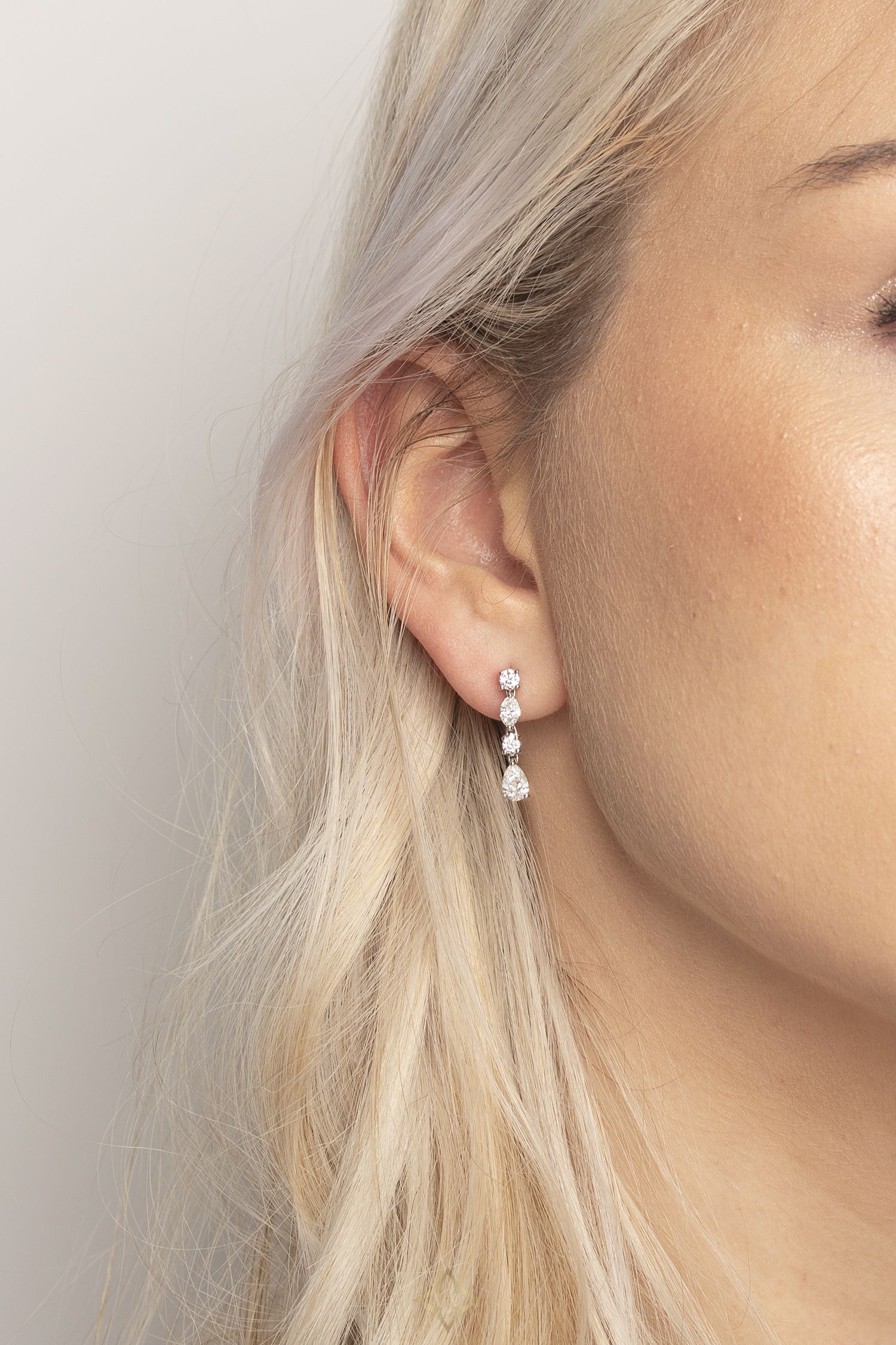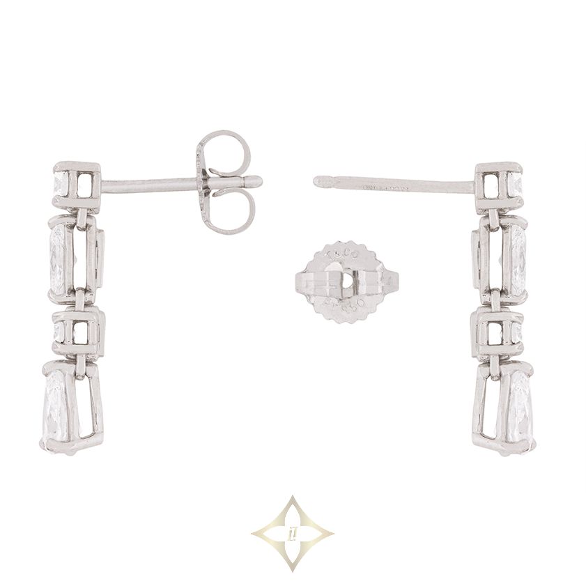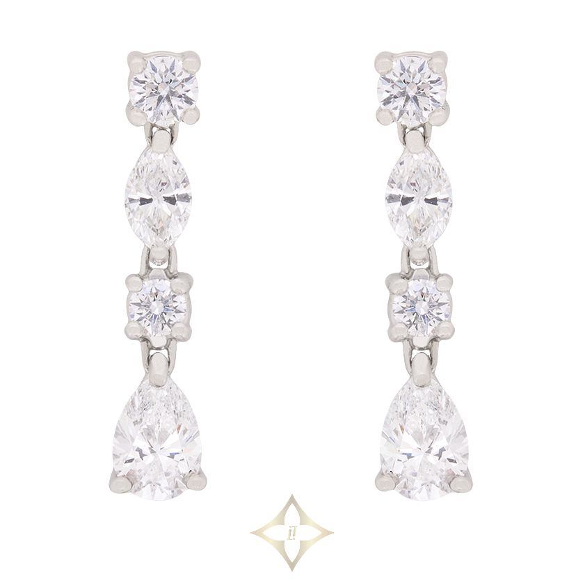 These beautiful earrings are from the Tiffany & Co. ‘Jazz’ collection. They are drop earrings and feature a range of diamond shapes, making them unique. The bottom of the earring features a pear shape diamond, each weighing 0.40 carat. Above the pear shape diamond there is a round brilliant, which is also at the top of the earrings. The middle round brilliant is 0.10 carat stone and the top stone is 0.15 carat. There is also a marquise shaped stone in between the two round brilliants which weighs 0.20 carat. This brings the total of each earring to 0.85 carats. The diamonds are of excellent quality, with an estimated of F in colour and VS in clarity. The piece is crafted from platinum, typical of Tiffany & Co., it has the original’s makers marks. The wonderful earrings come with butterfly backs also made from platinum. These earrings would make a lovely gift!