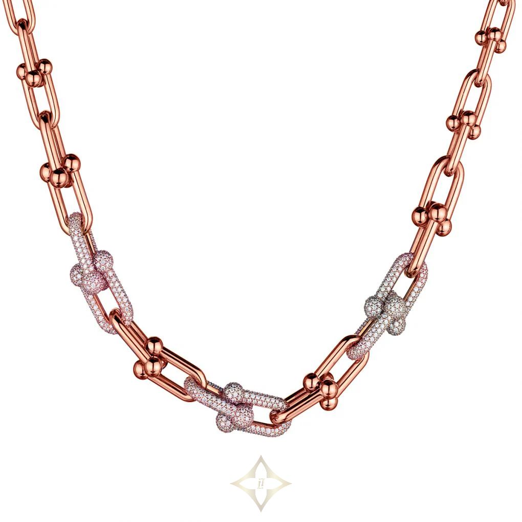 Tiffany & Co Hardwear necklace with diamonds. 18kt rose gold graduated link necklace. Pave' set diamonds weighing 9.07 total carat weight of Brilliant cut diamonds. 18 " in length. Circa 2022.