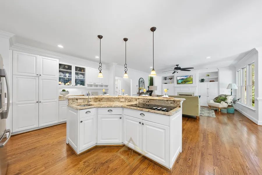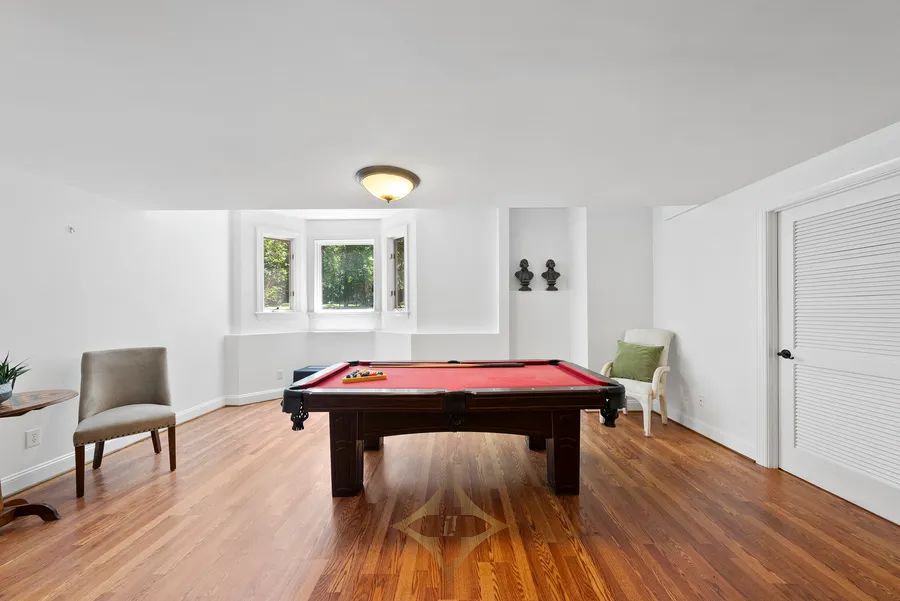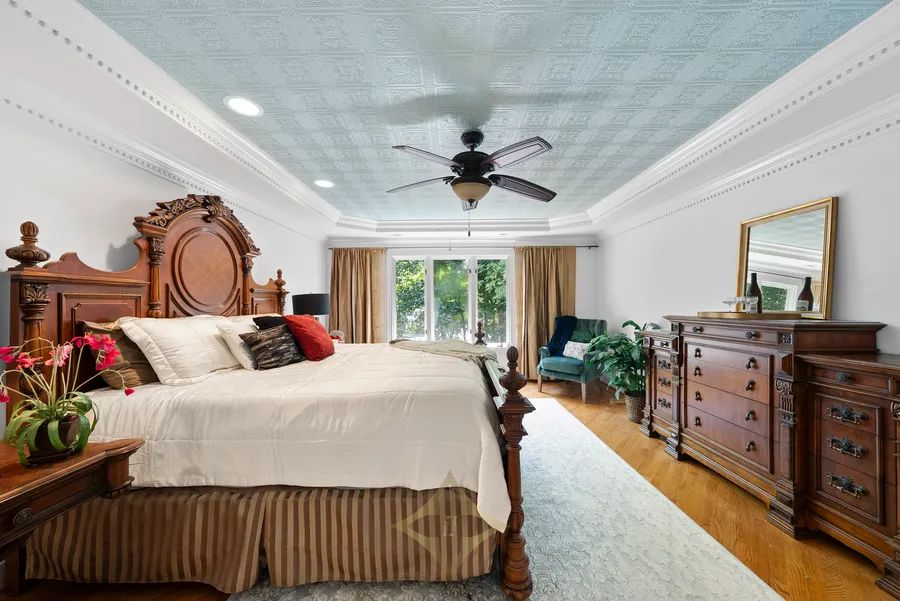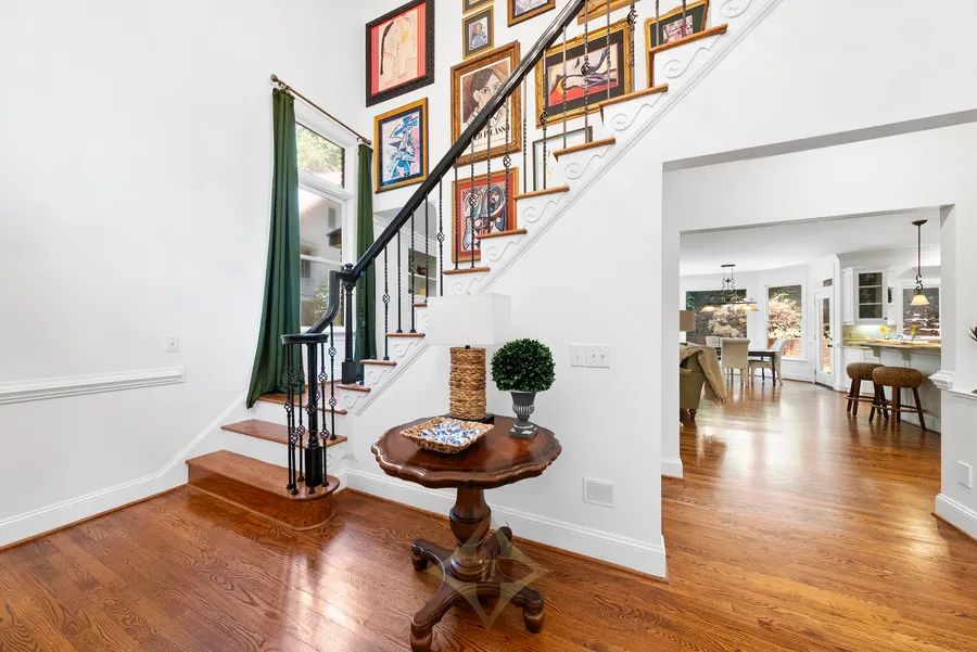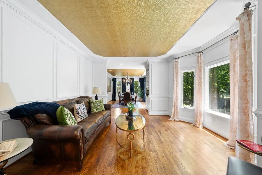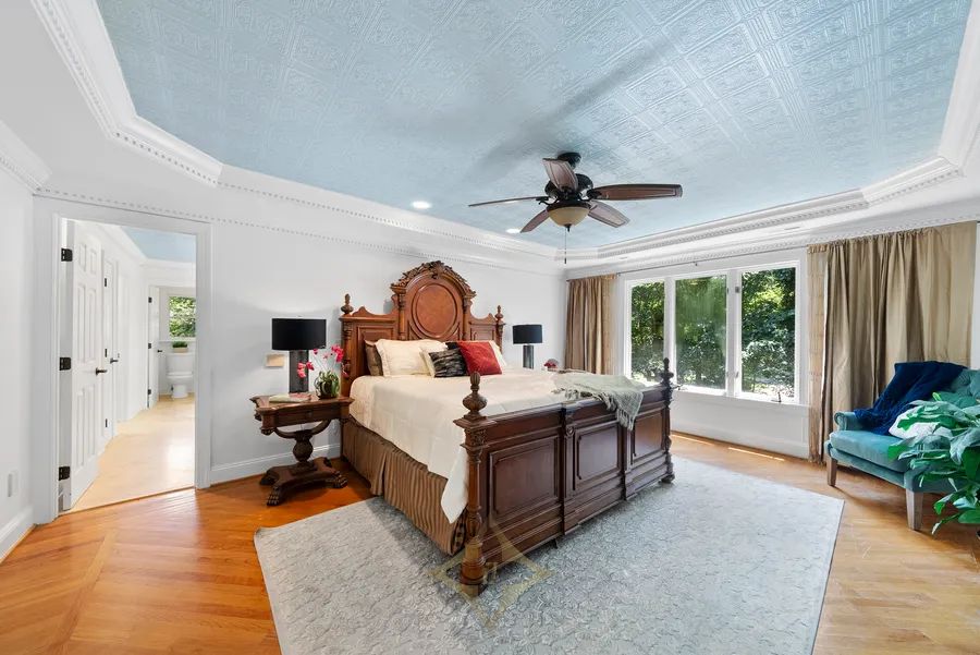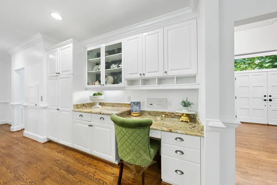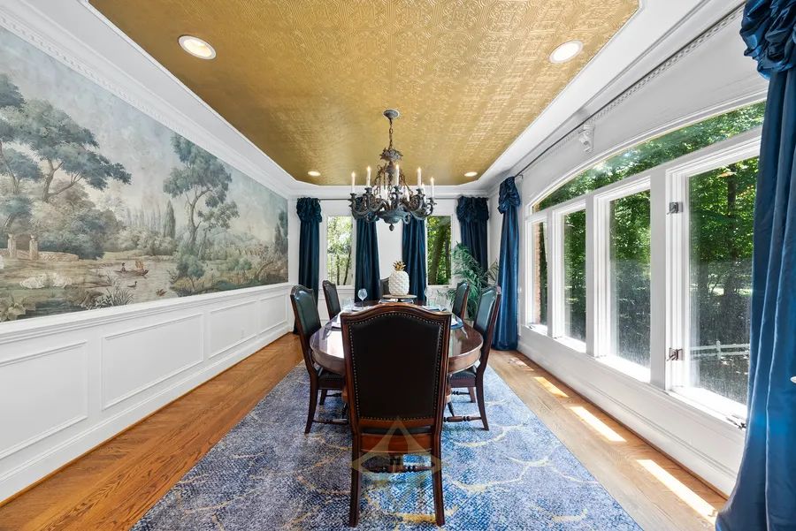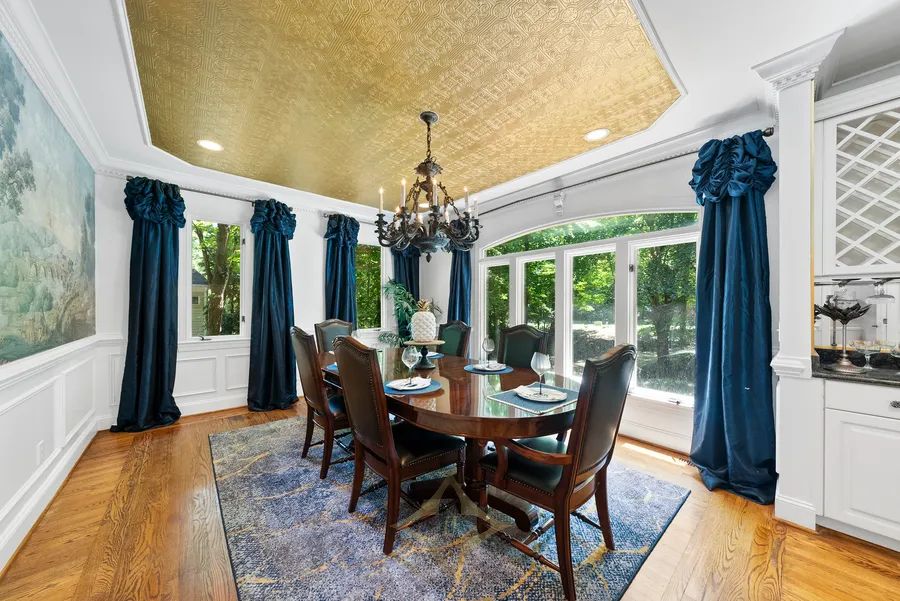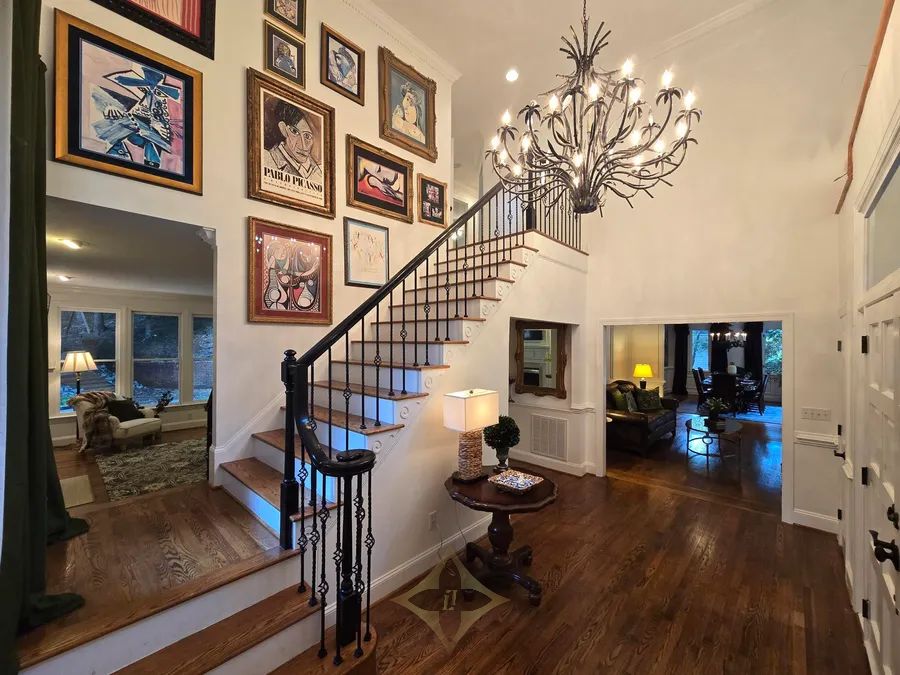 Step into a dramatic two-story foyer with iron balusters and hardwoods that set the tone for this multi-generational layout. The gourmet kitchen features a large island, stainless steel appliances, and granite counters, flowing seamlessly into a spacious family room with a marble fireplace and a breakfast nook overlooking the wooded backyard retreat. A rare electric dumbwaiter effortlessly moves items from the garage to the kitchen, enhancing your living experience. Formal living and dining rooms offer gold-painted decorative ceilings and custom trim, complemented by a wet bar, office, and main-level guest suite with a full bath.