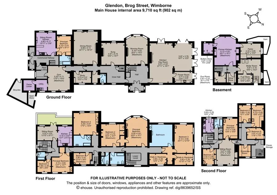 Upstairs, the main house features five wellpresented double bedrooms, including two which are en suite. The main bedroom has dual walk-in wardrobes as well as a large en suite bathroom, while all bedrooms include washbasins. There is also a further family bathroom and a separate shower room on the first floor. Stairs continue to the second floor, where there are three more double bedrooms and a dressing room.