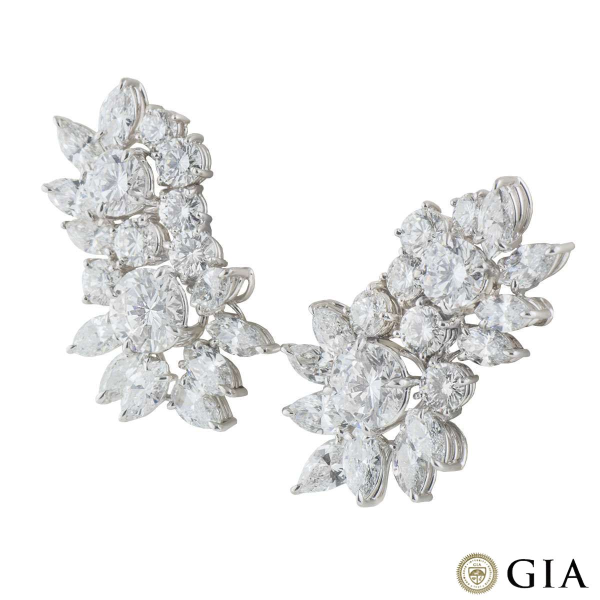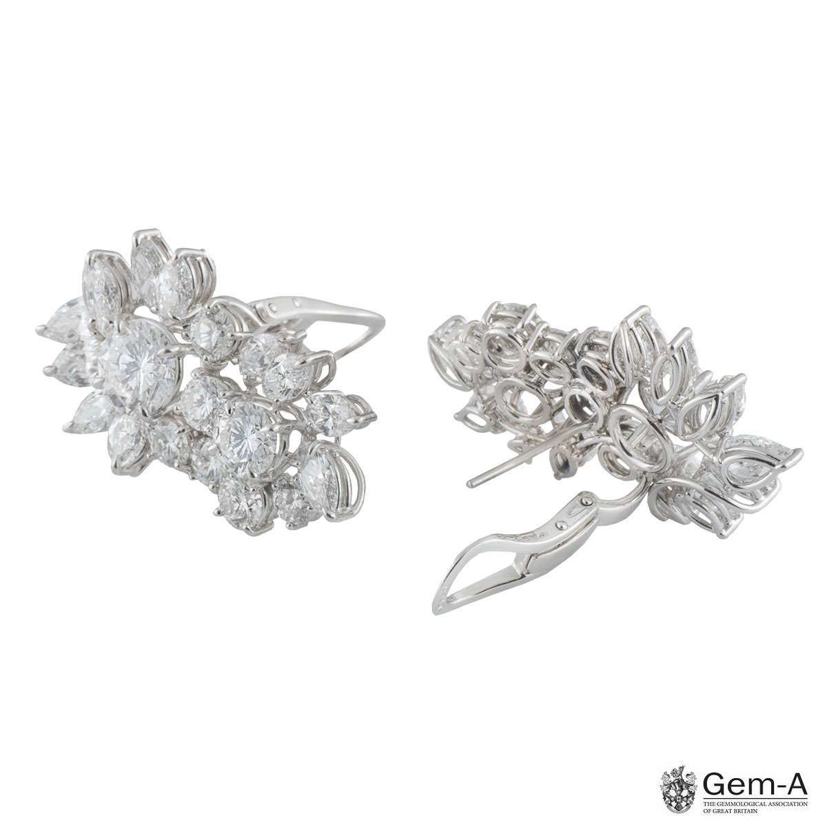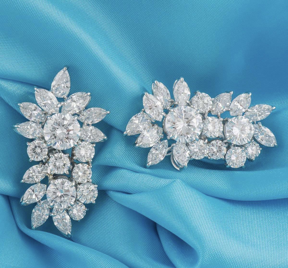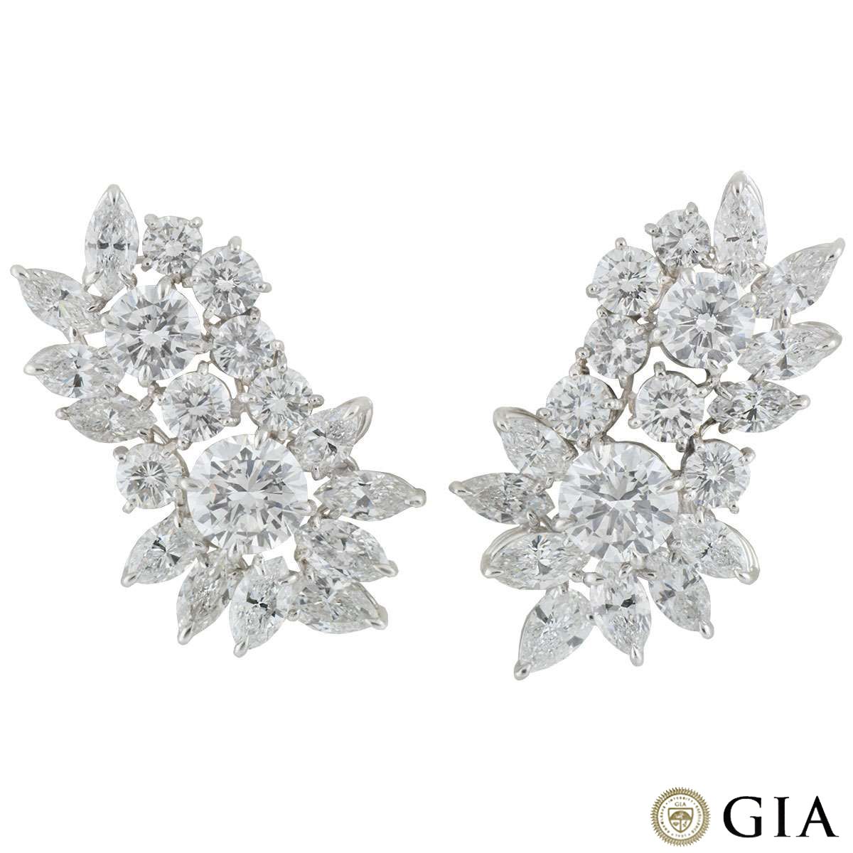 A pair of decadent diamond cluster earrings in platinum. Each earring is composed of a cluster design encompassing a mixture of round brilliant cut, pear cut and marquise cut diamonds. The first earring is comprised of a 2.05ct and a 1.02ct round brilliant cut diamond, both D colour and SI1 clarity. Surrounding the central diamonds are a further 17 diamonds totalling approximately 7.04ct, predominantly F-G colour and VS2-SI1 clarity.