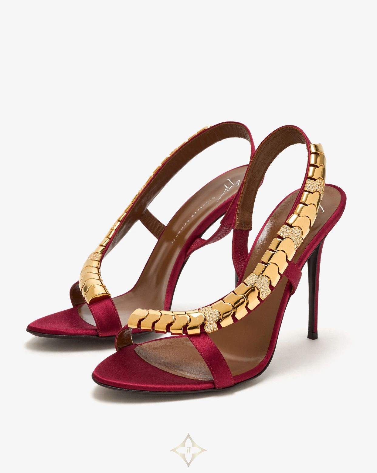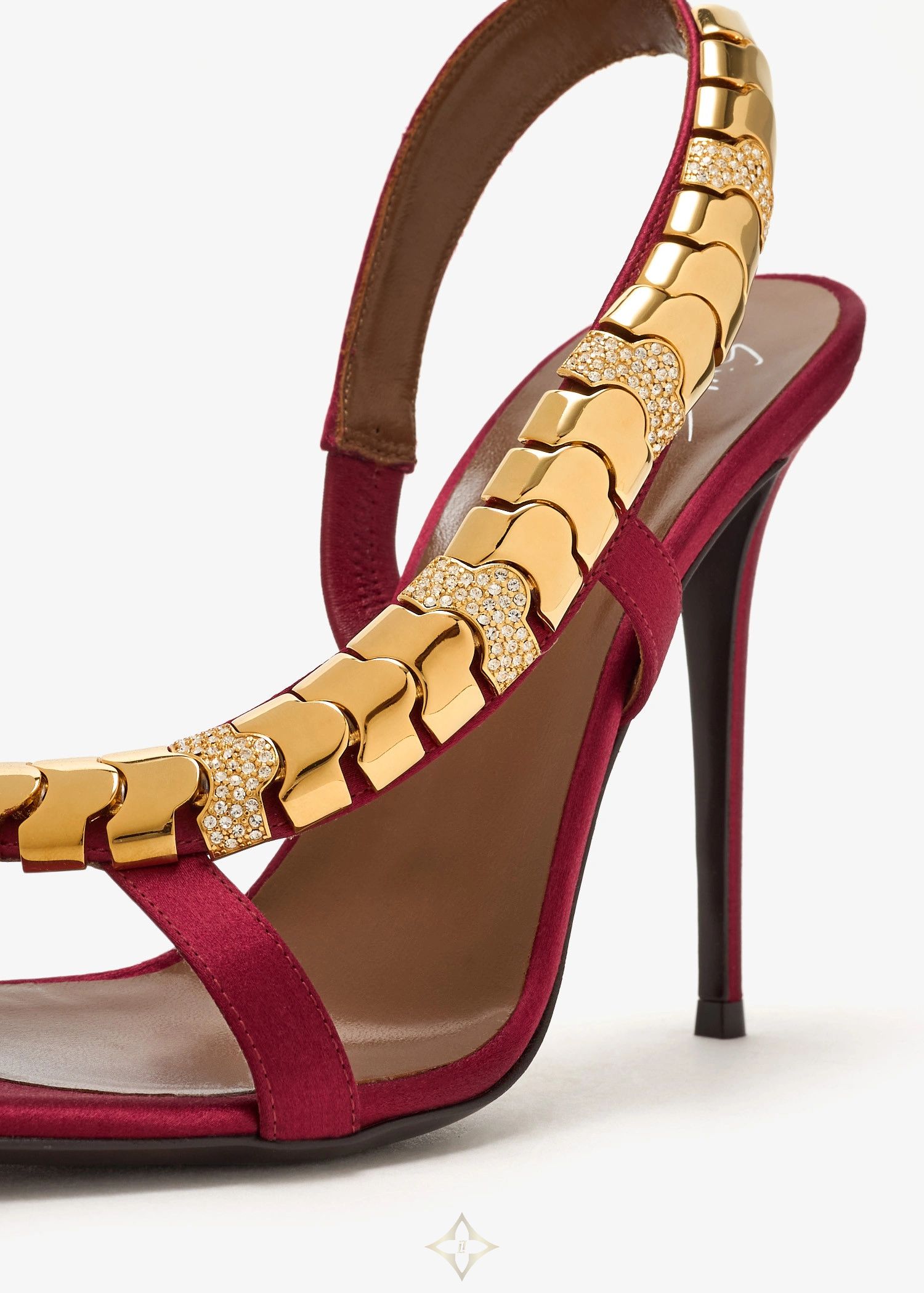 Sculptural gold hardware cascades down the arch of these slingback sandals, adding a touch of high-gloss glamour to a classic silhouette. A barely-there front strap and stiletto heel balance opulence with elegance.