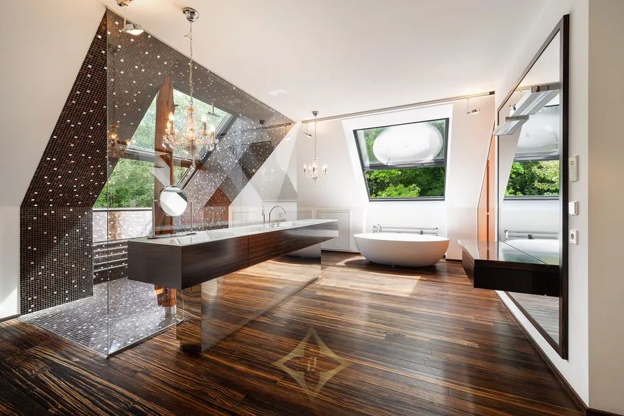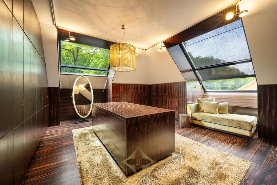 The entire villa was completely renovated, including all of the ancillary facilities and the beautiful grounds, in accordance with the requirements of the preservation order. The Eham joinery was in charge of the interior fit-out. Michel Bäder was responsible for the bathroom and wellness areas. Today, the villa shines in the splendor of its historic appearance with a reconstructed new roof and a penthouse, the likes of which can only be found once in Munich’s city center.