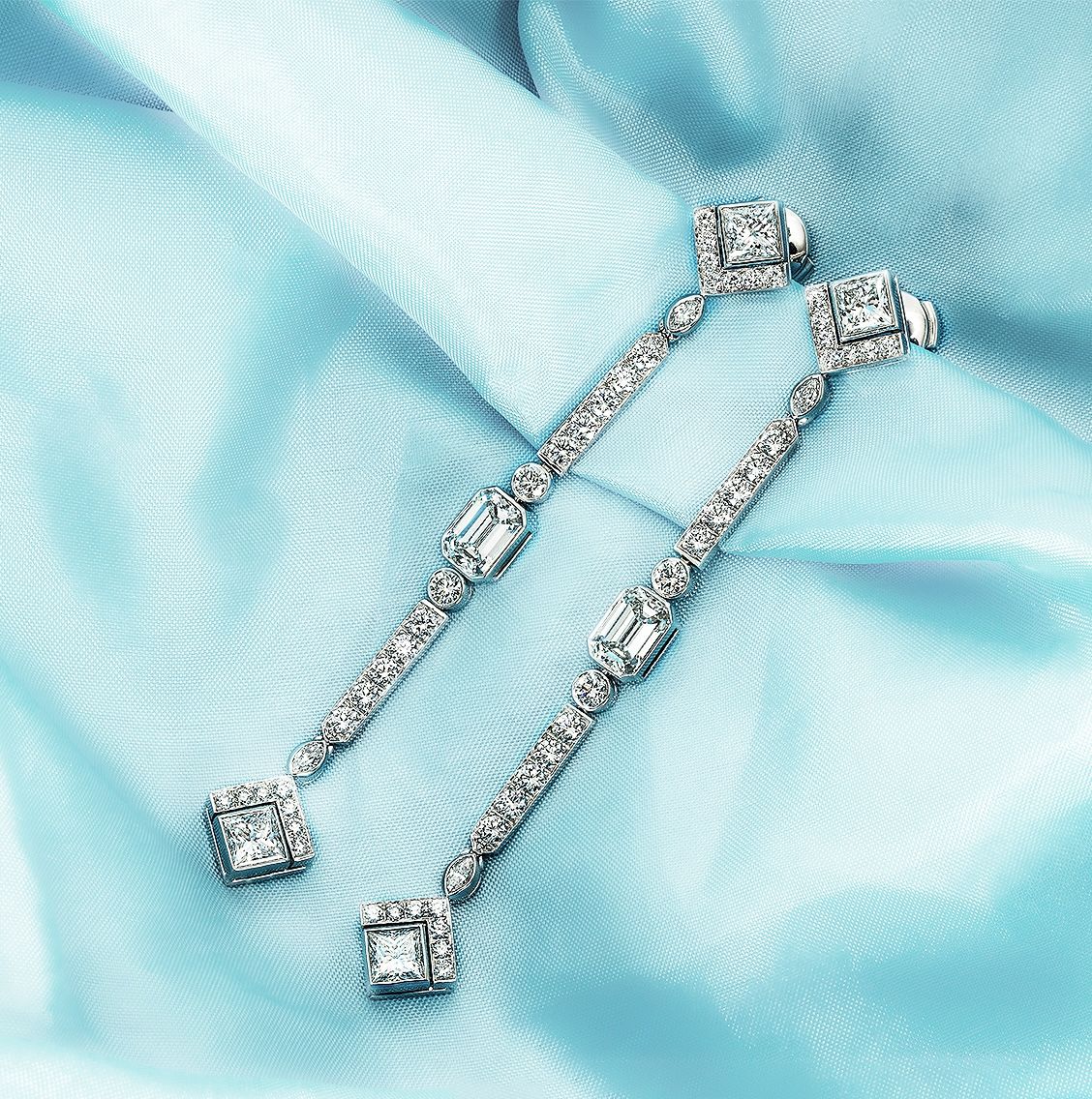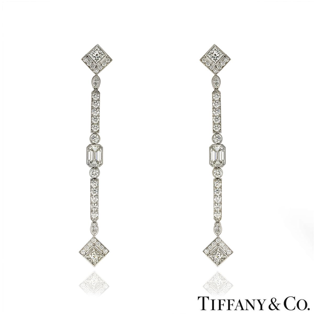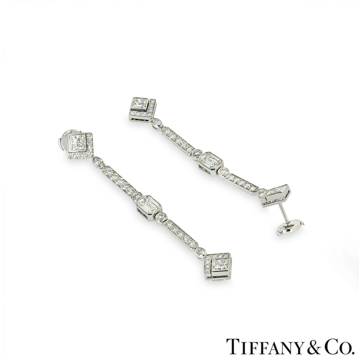 A bespoke pair of platinum diamond drop earrings by Tiffany & Co. Both earrings start with a square cut diamond encased at the bottom by 7 round brilliant cut diamonds, followed by a bezel set marquise cut diamond and a row of 5 round brilliant cut diamonds. Set to the middle of the drop is a stunning emerald cut diamond in a bezel setting, with a bezel set round brilliant cut diamond on either side which suspends a second row of 5 round brilliant cut diamonds. Finished with another bezel set marquise cut diamond and the final square cut diamond encased at the top by a single row of 7 round brilliant cut diamonds. The earrings measured 7.25cm in length and 1.1cm in width, finish with post and alpha back fittings and have a gross weight of 13.9 grams.
