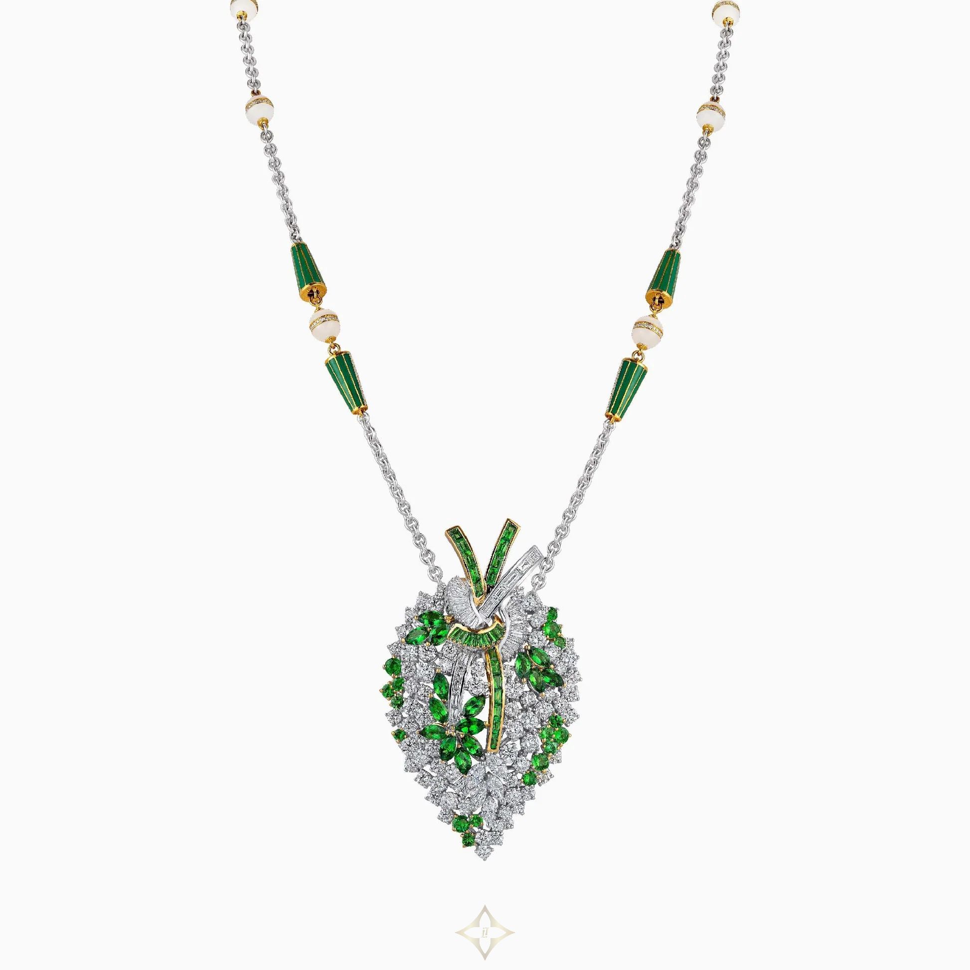 Tsavorite and Diamond Pendant A pendant crafted with rare Tanzanian tsavorites and diamonds of various cuts beautifully orchestrated into a distinctive piece of jewellery. Product Details Technical Information Marquise shaped diamonds 0.99 carats, F/G color Round shaped diamonds 7.94 carats, G/H color, VS1 clarity Taper shaped diamonds 2.10 carats, F/G color, VVS2 clarity Tsavorite 8.35 carats Mother of pearl Small brilliant diamonds 0.74 carats 18 Karat white gold Reference: DPN08251 Regular price: $45,500.00 ——— Aliel Jewellers Phone: +971 50 550 4517 WhatsApp: +971 56 336 9299 Email: enquiries@aliel.com SHOWROOM LOCATION * U.A.E. Dubai Khalil Al Sayegh Jewellers Al Maktoum Street Deira, P.O.Box 3112, Dubai, UAE Phone: +9714 2217999 Email: info@aliel.com * Pakistan, Lahore Shop # 51/64, Shopping Arcade, Pearl Continental Hotel, Mall Road, Lahore- Pakistan Phone: +92(42) 3636 2660 Email: lahore@aliel.com