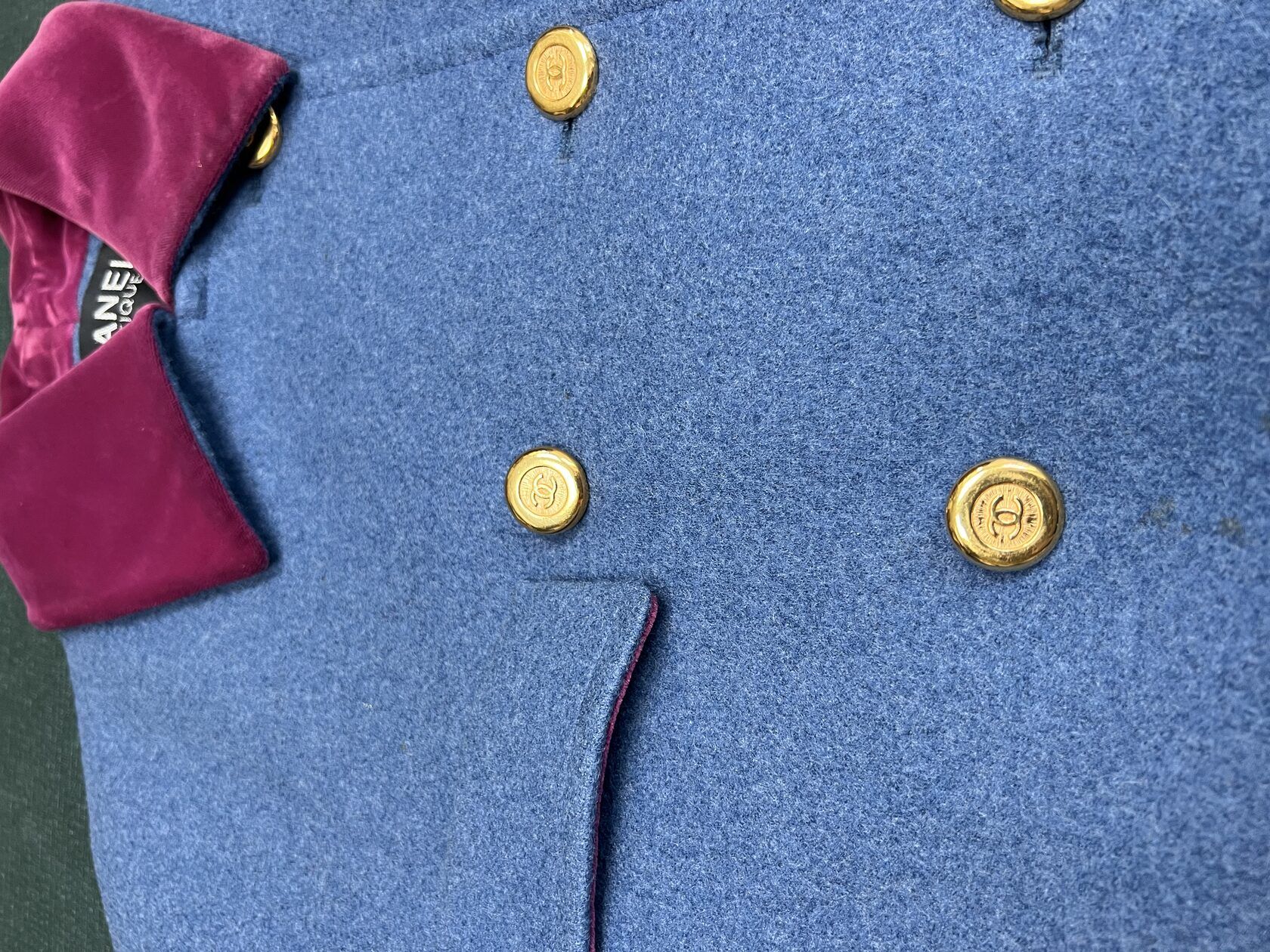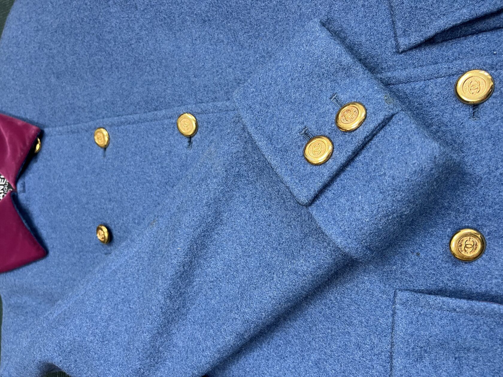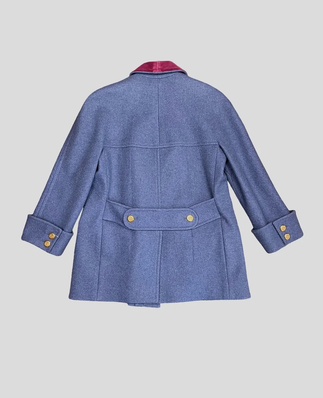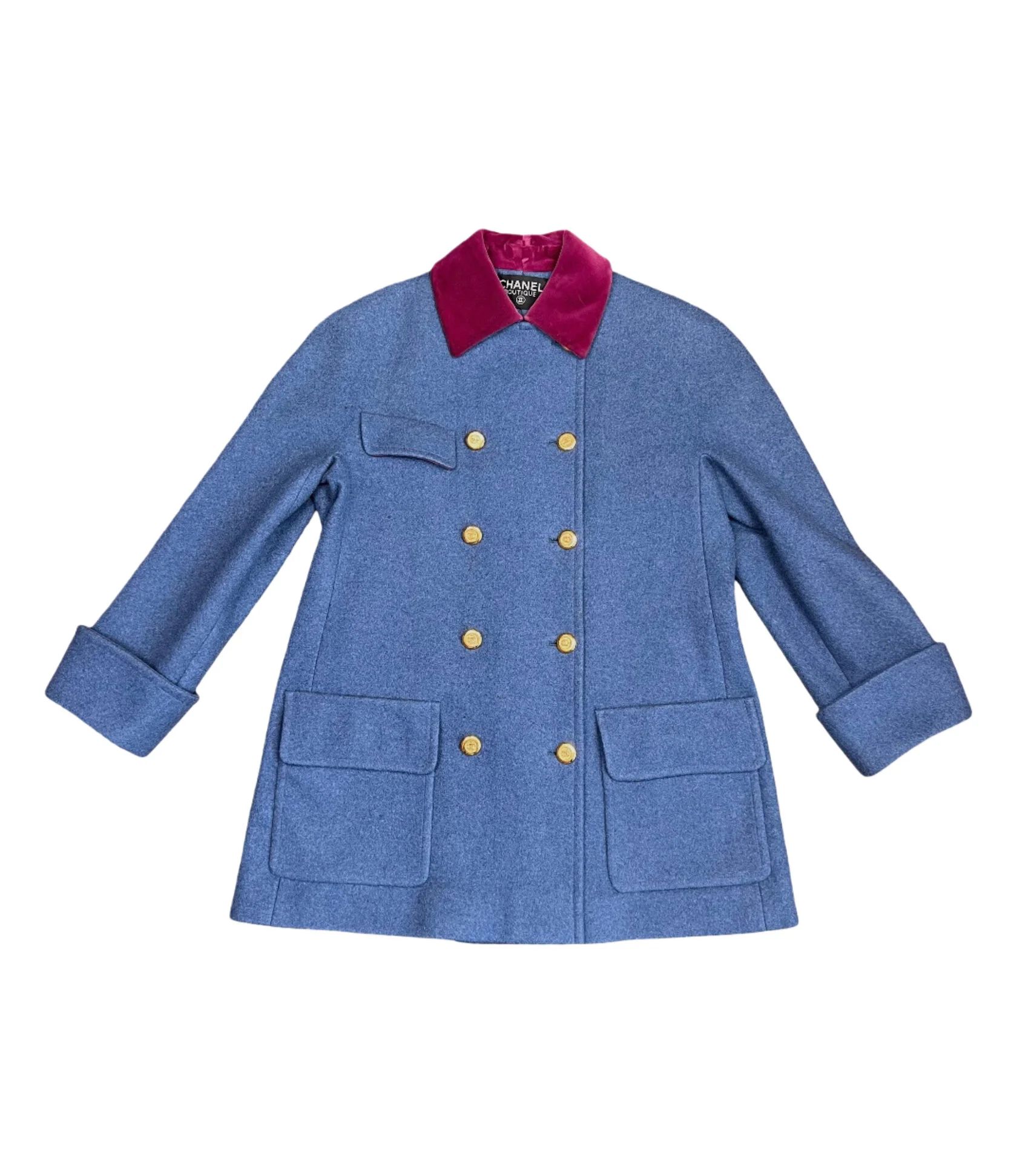 Vintage Chanel Navy color double breasted coat. 1991 Fall Runway collection. Gold CC buttons. Red velvet undertones. Wide turn up cuffs. No signs of use.