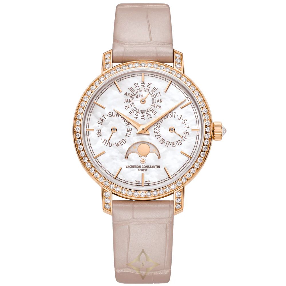 Vacheron Constantin Traditionnelle Perpetual Calendar Ultra-Thin Ladies Strap Watch - 4305T/000R-B947. 18ct pink gold 36.5mm rounded diamond set case and bezel, all featured on a light pink alligator leather strap with classic ardillon buckle. This ladies watch has a mother of pearl dial with sub-counters for the date, day and month, as well as a moon phase display at the 6 O'clock position. Scratch resistant sapphire crystal glass and water resistant up to a total of 30 metres. 1120 QP self-winding movement with 40 hours of power reserve.
