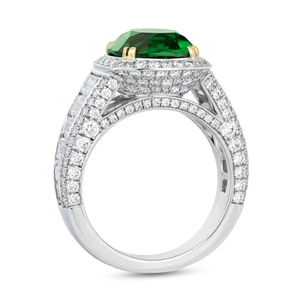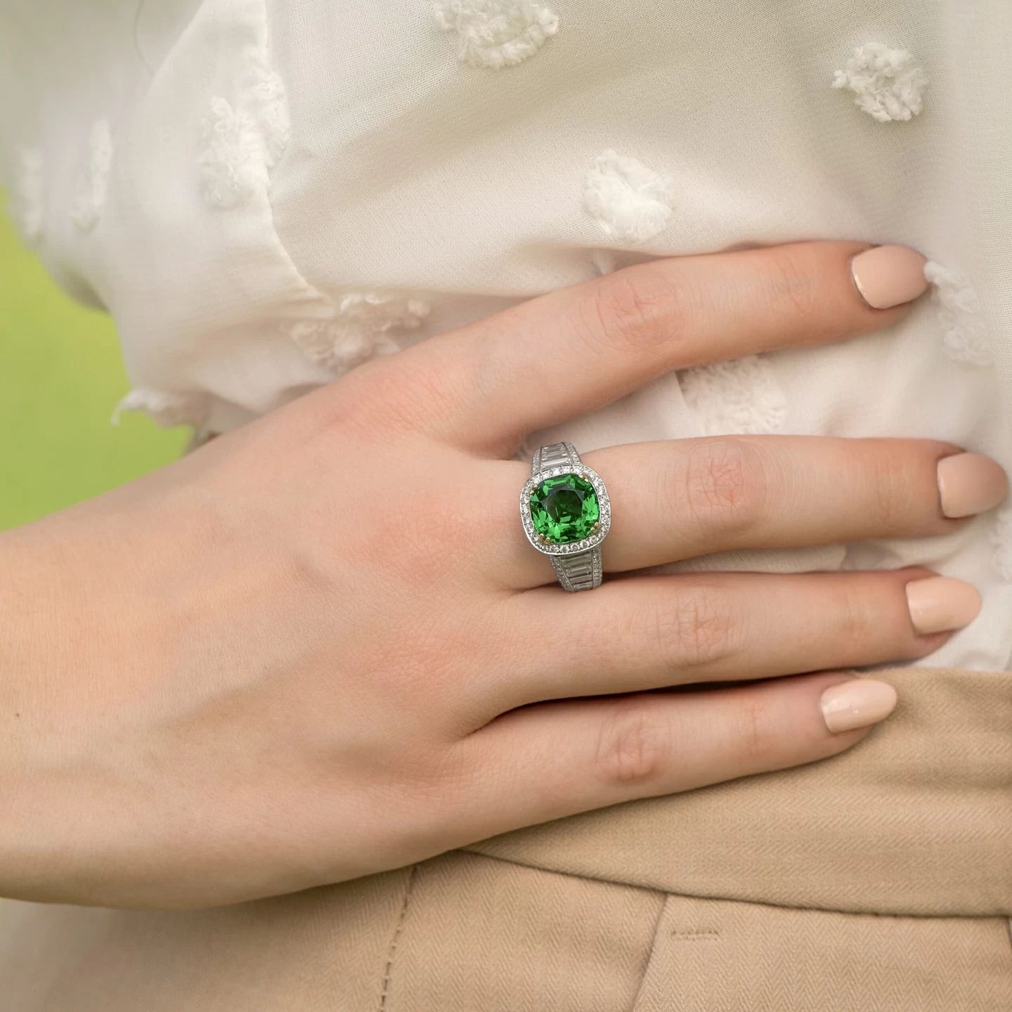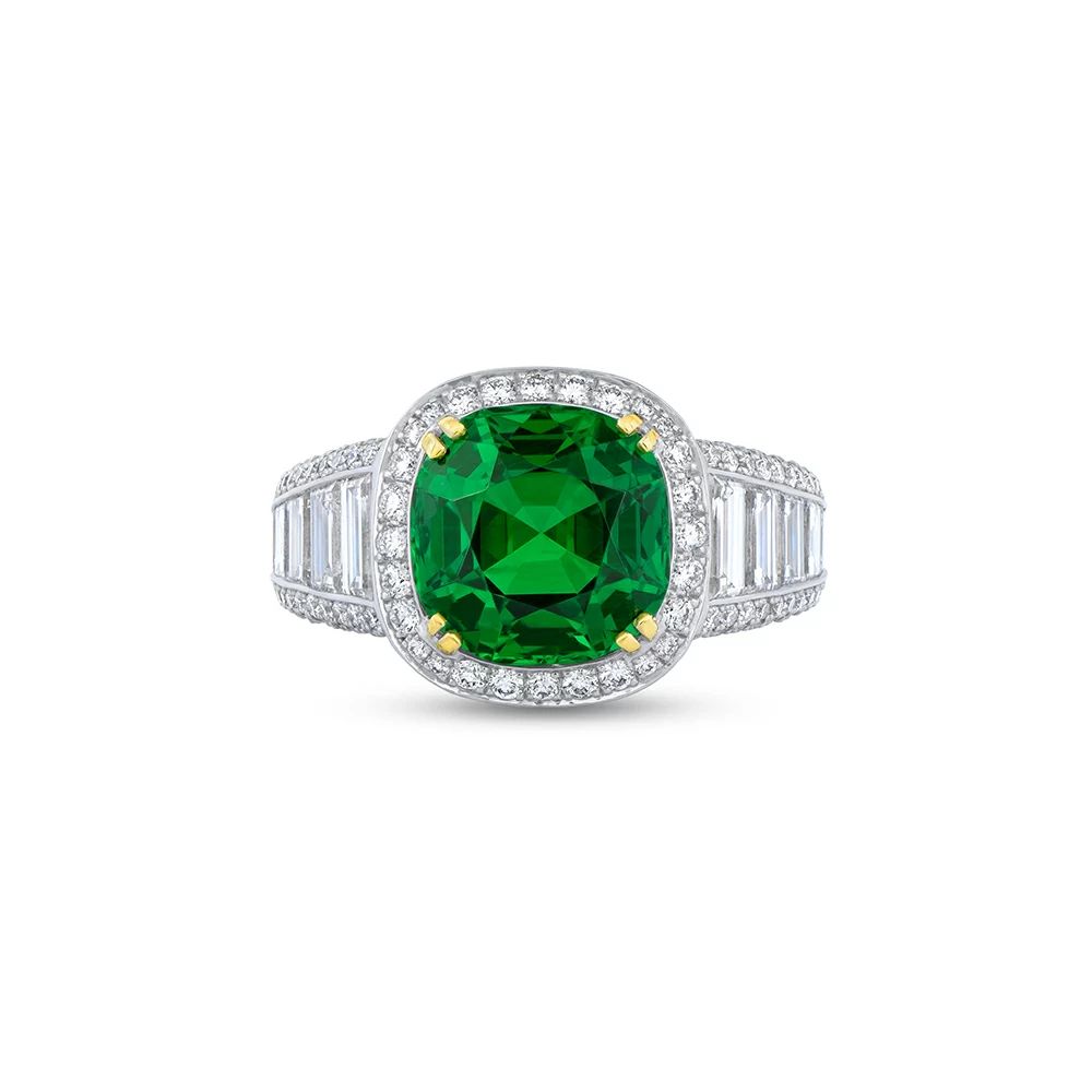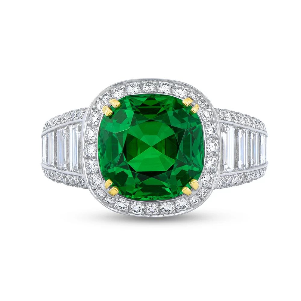 Tsavorite Garnet Ring STYLE NO: 041023 This stunning gemstone is one of the most coveted variations of garnet due to its lush color and scintillation. An incredible 5.22-carat cushion-cut tsavorite garnet is accentuated with 3.14 carats distributed between a delicate halo of round brilliant diamonds and tapered trapezoid diamonds. Even royalty would be jealous of this luxurious platinum ring! PRICE: $44,900 Originally $99,000 ——— WIXON JEWELERS