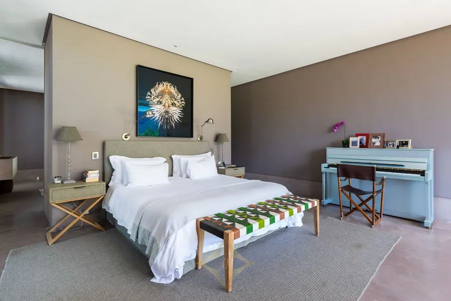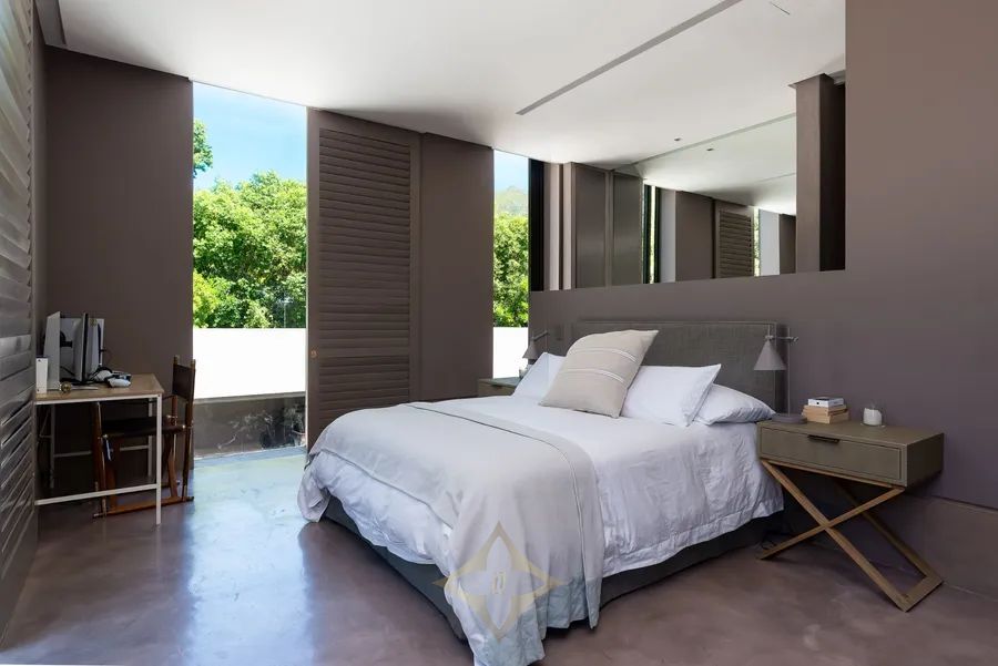 Upstairs, twin staircases with sleek glass railings lead to five magnificent en suite bedrooms, each offering its own sense of serenity and style. The master suite, with its expansive mountain vistas, includes a private balcony and an open-air shower.