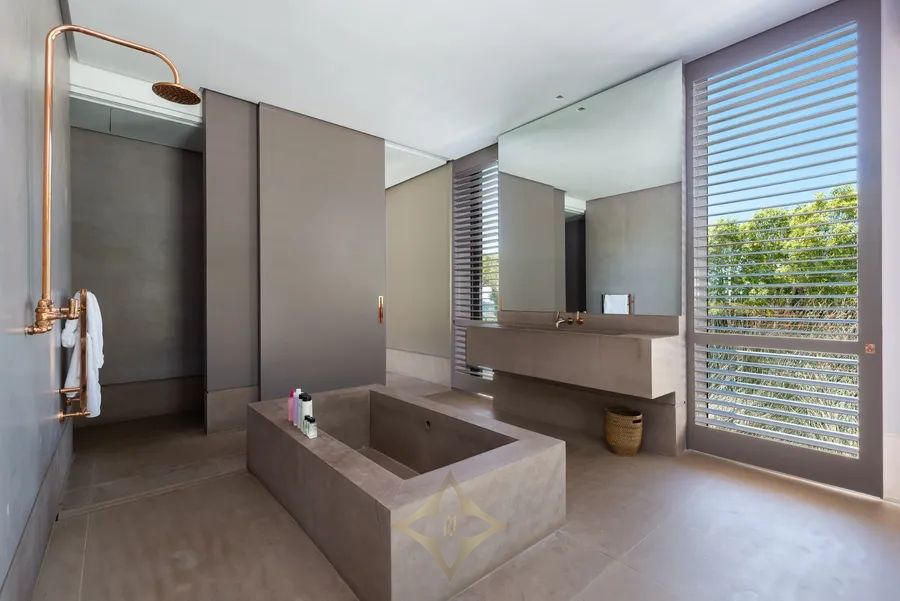 The open-plan layout is central to the home’s connection with nature, where large, concealed glass sliding doors and expansive windows seamlessly bring the outdoors in. Inside, minimalist luxury defines the space, with smooth screeded floors and elegant brass accents that give the interiors a sophisticated yet understated feel. Bespoke furnishings and carefully selected art pieces enhance the modern, contemporary atmosphere, all bathed in earthy tones of neutral greys and browns.