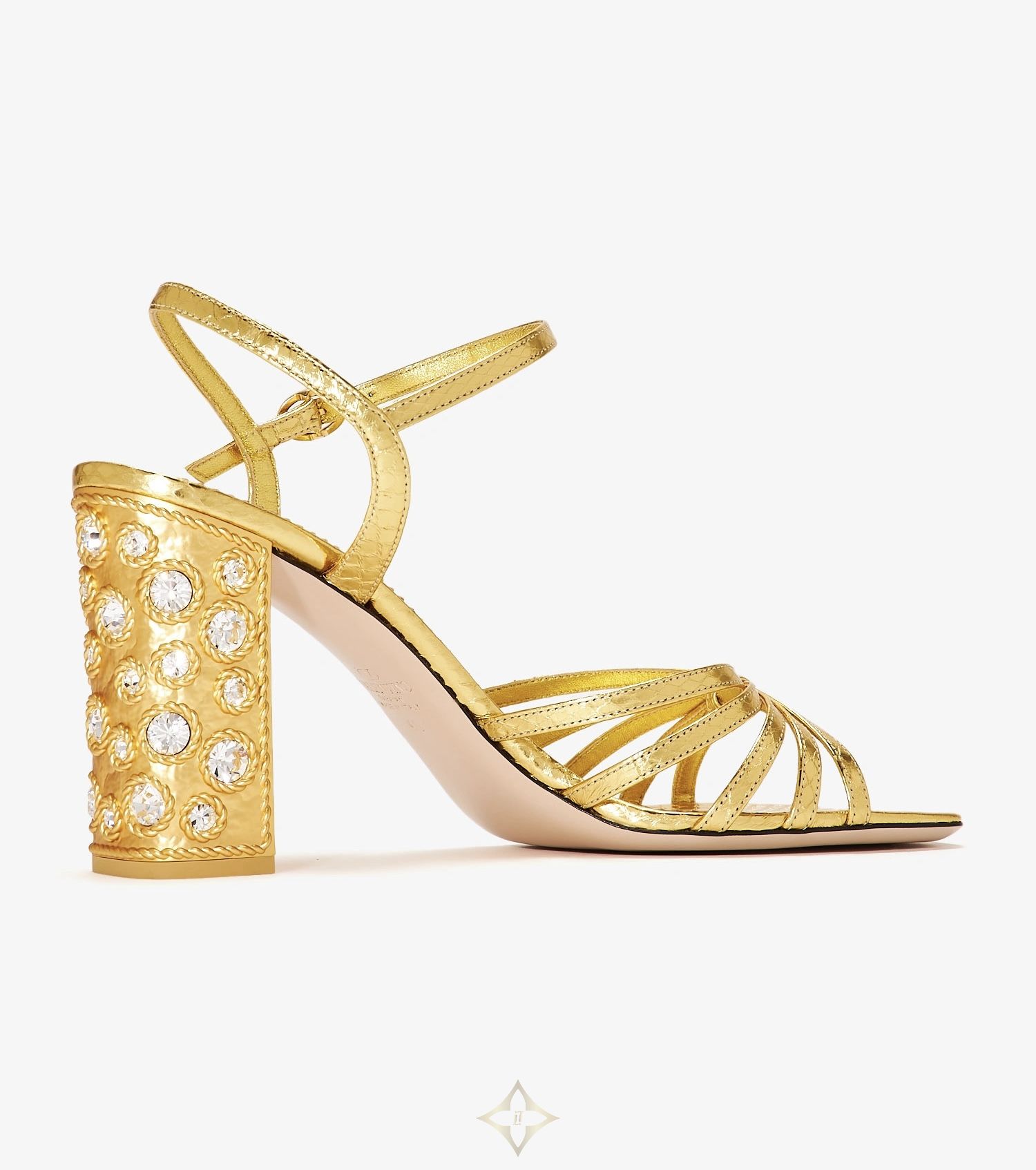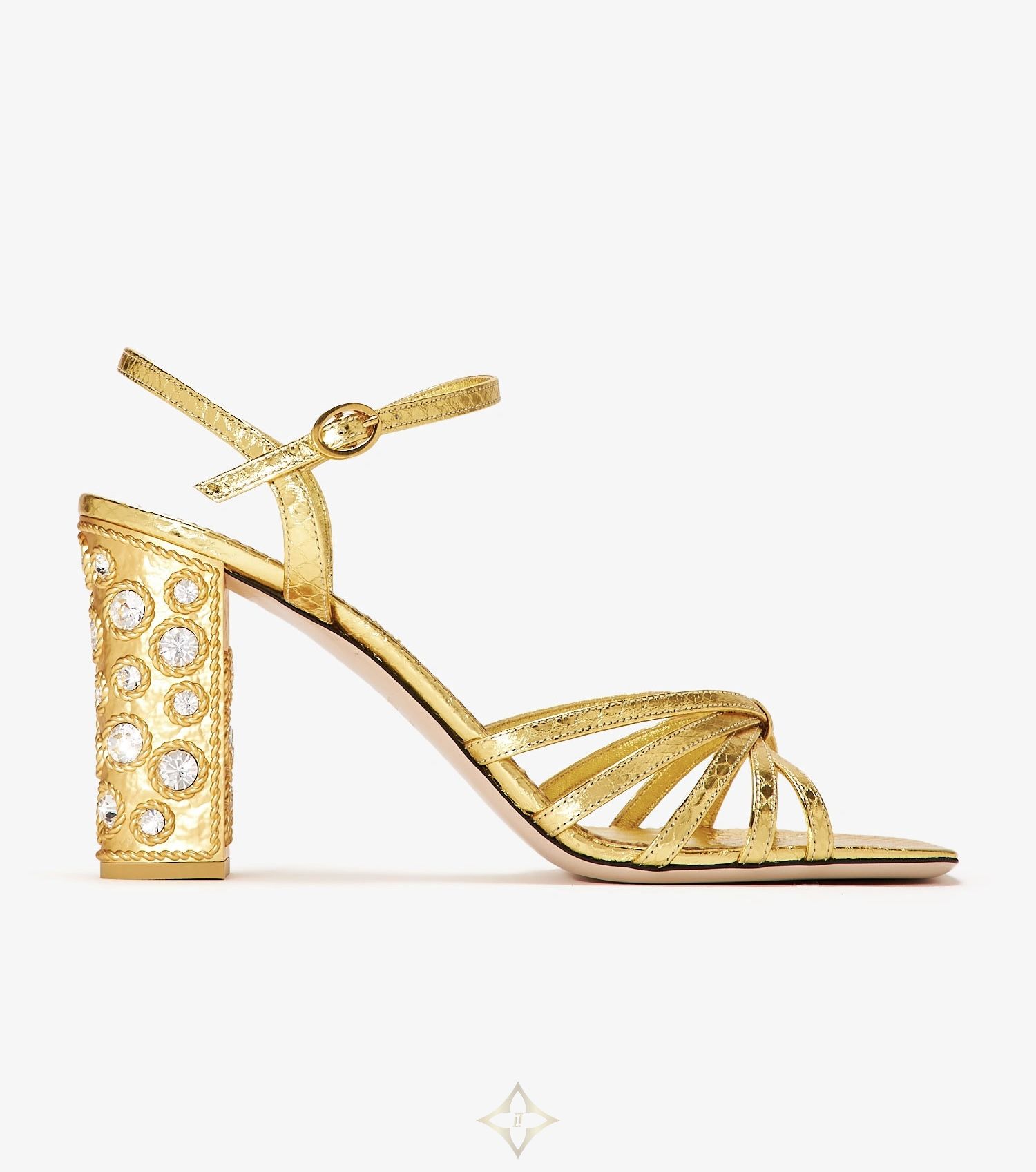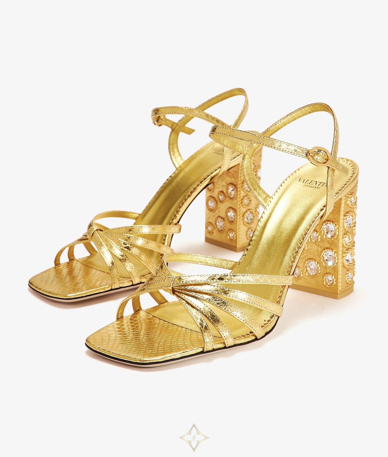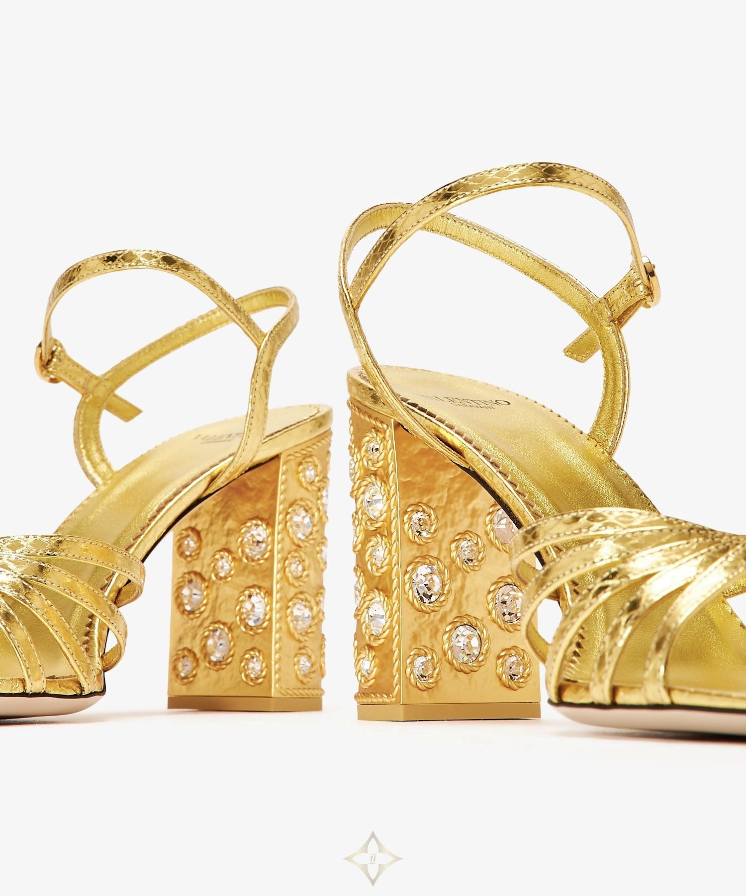 Valentino Garavani presents the ultimate party +1 with these striking Preshoes crystal sandals. With a bold, confident allure, they're crafted in laminated Ayers snakeskin with a strappy upper, an adjustable ankle strap, and a galvanized block heel in a vintage brass finish adorned with crystals.